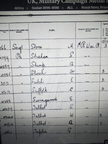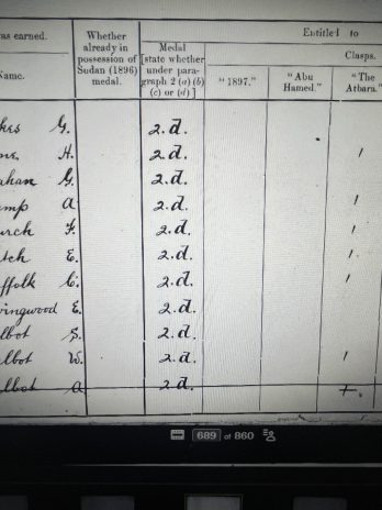 The campaign medals awarded were the Queen’s Sudan Medal 1896-1898 and the Khedive’s Sudan Medal 1896-1908, with the clasp on the Khedive’s medal of ‘Khartoum’.