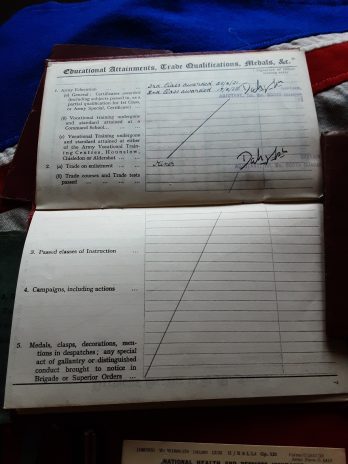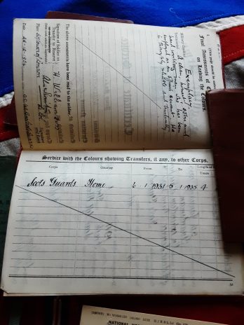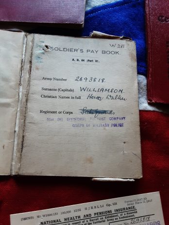 Brown soldiers service and pay book shoeing he reenlisted 3 November 1939 into corp of military police.