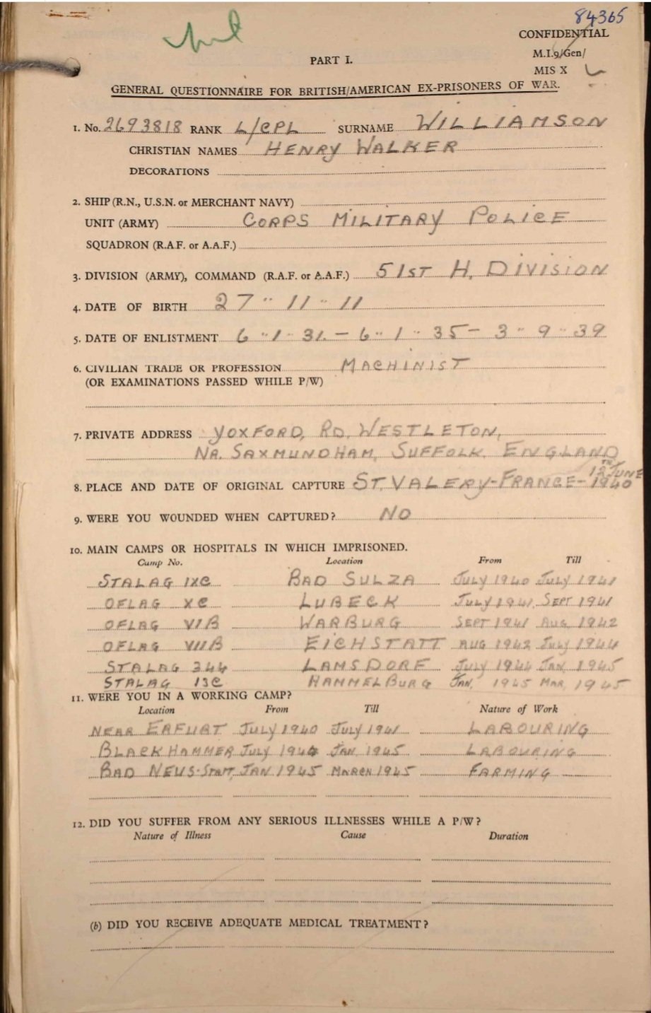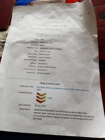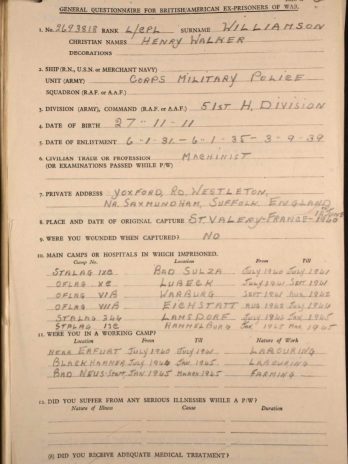Captured at St Valery he spent the rest of the war as a prisoner of war in various camps inc stalag 344, lamsdorf in Poland .