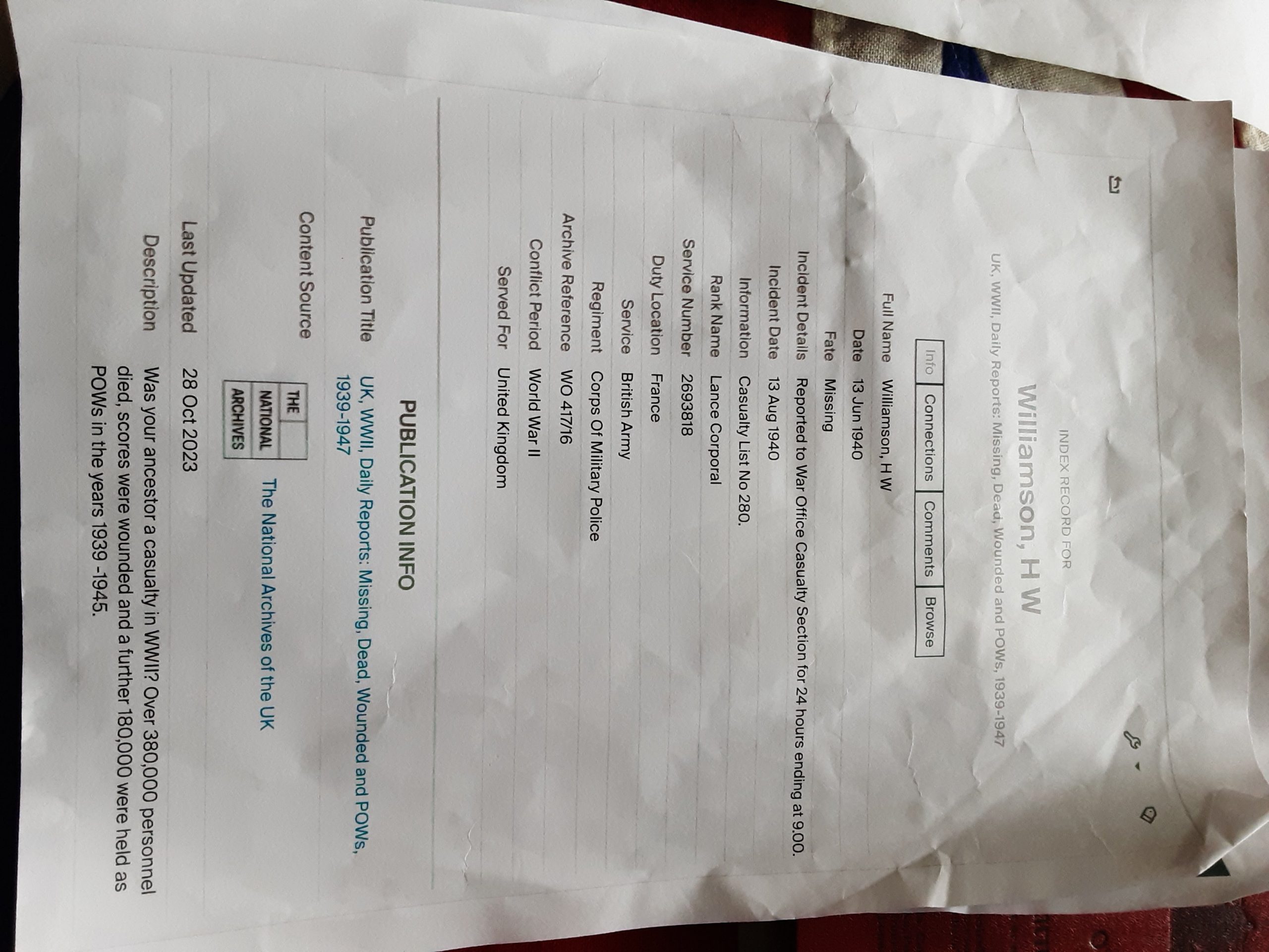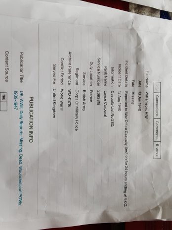 He was listed missing 13th of June 1940 whist serving with 51st Highland division provost Coy.