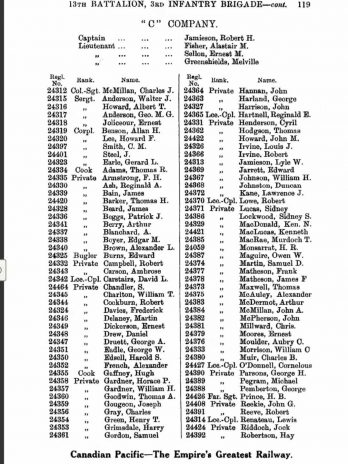 Ww1 he is listed as a Lieutenant c Coy 5th regiment Royal Highlanders of Canada Canadian Pacific, 13th Battalion, 3rd infantry brigade.