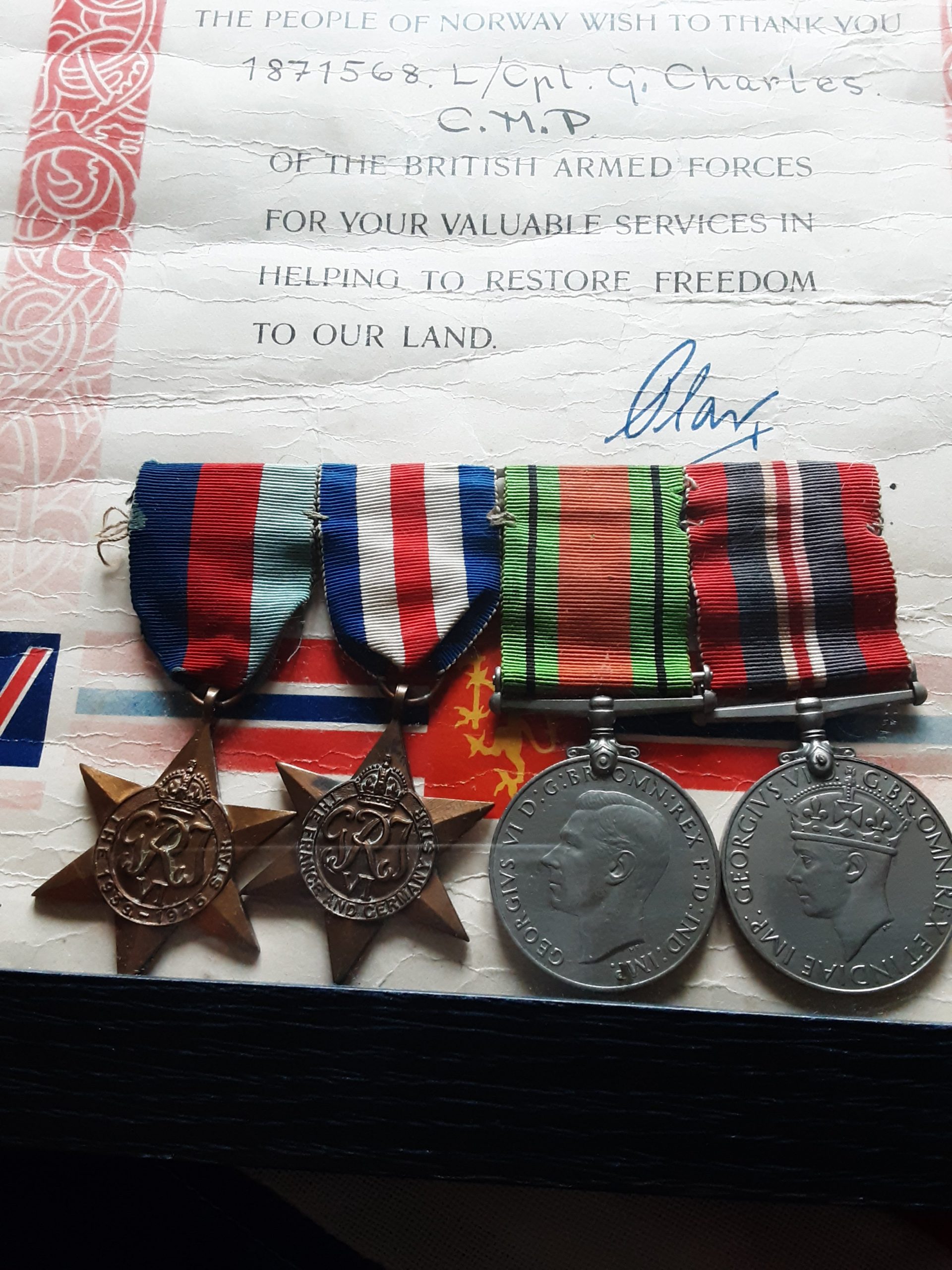 A framed up liberation of Norway certificate named to 1871568 l/cpl g Charles c.m.p.