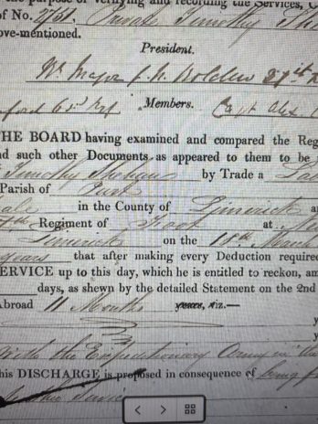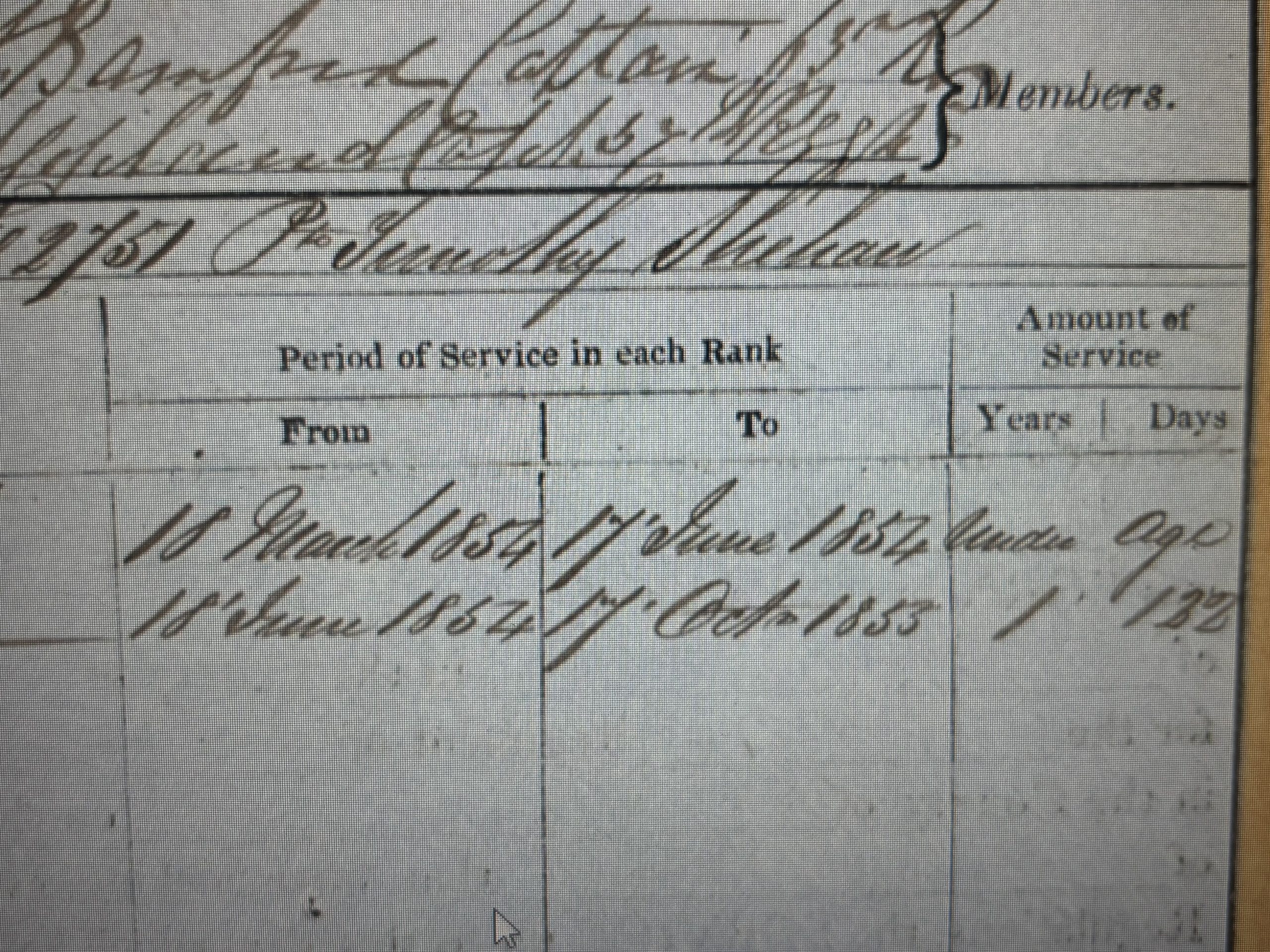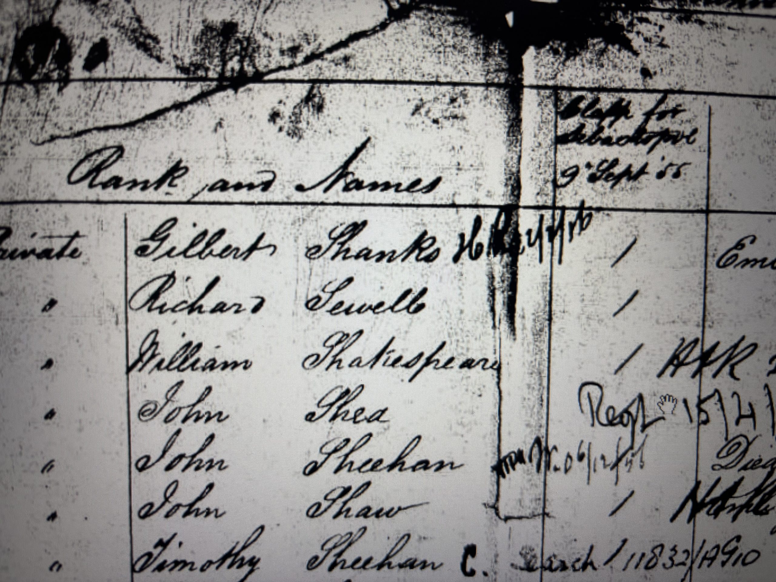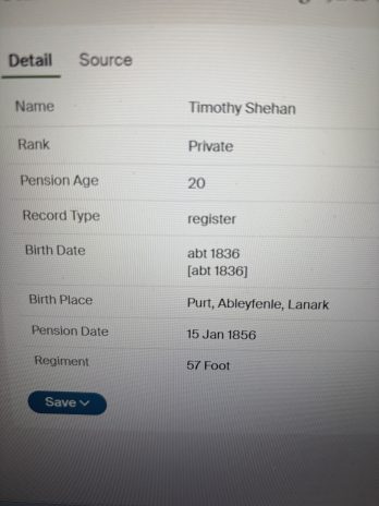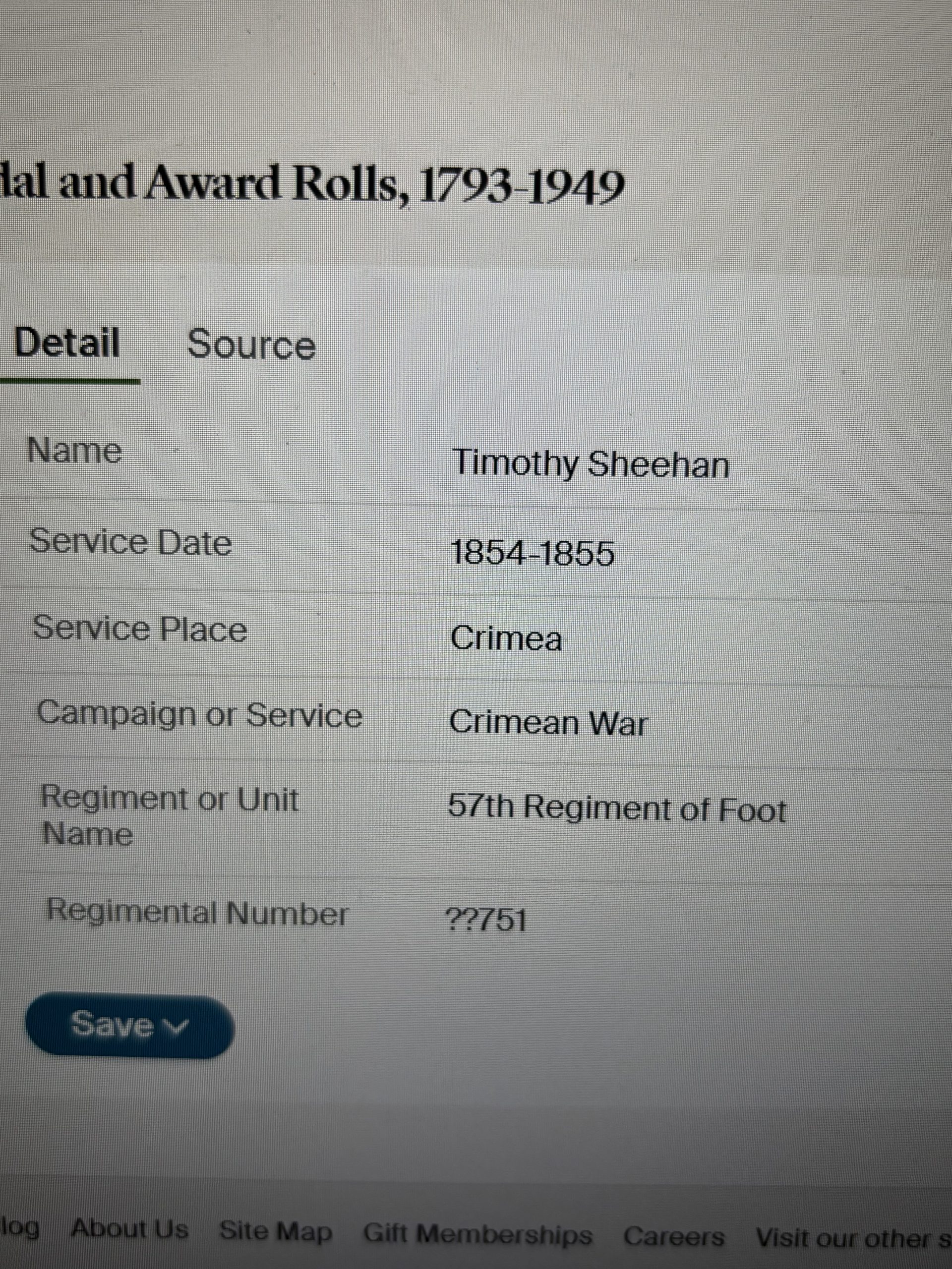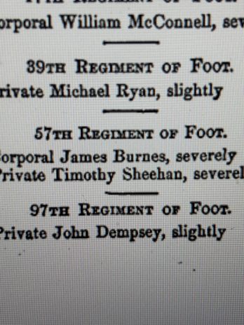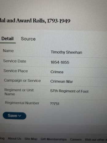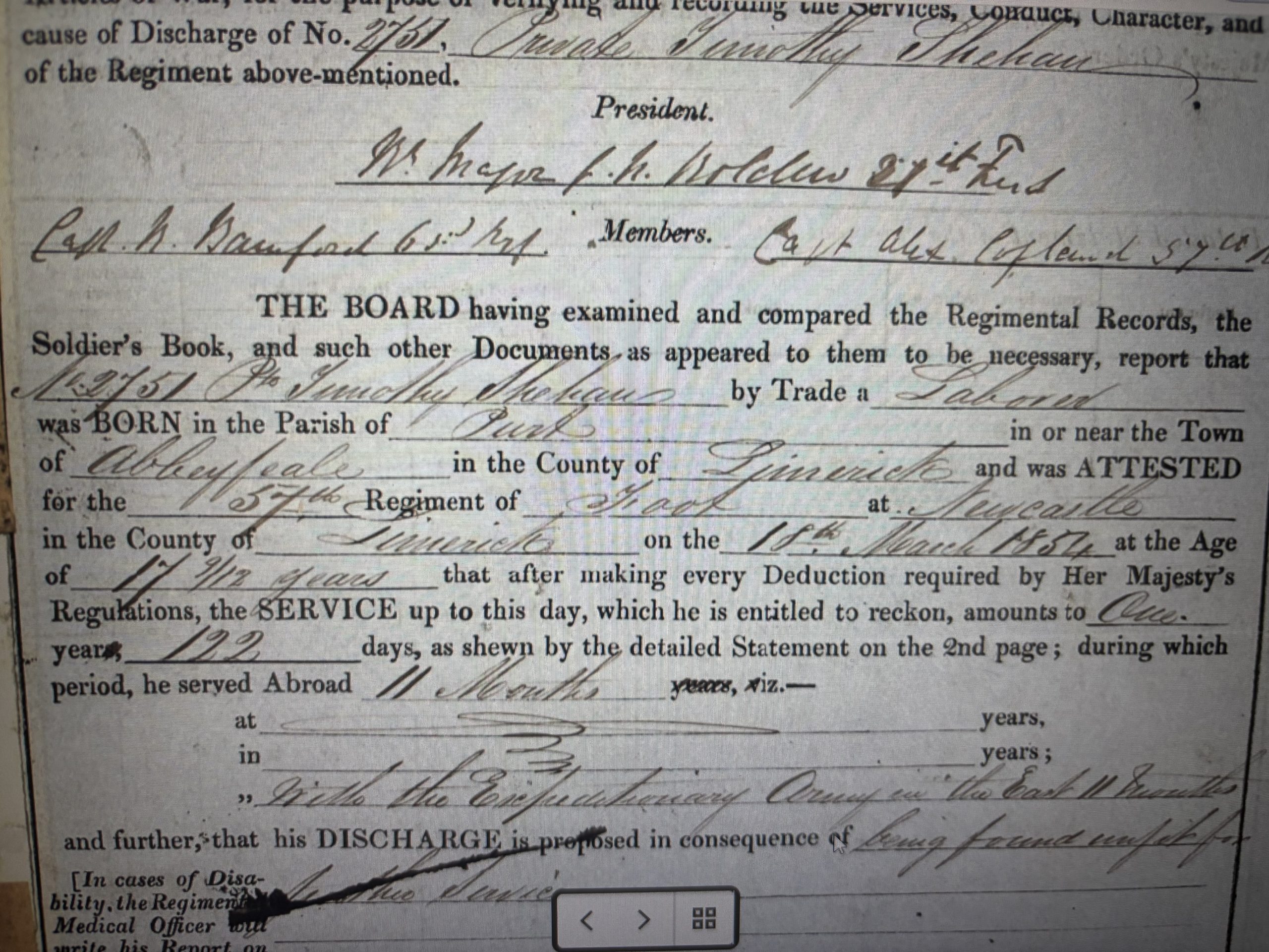 Timothy enlisted in March 1854 and was given the service number 2751 with the 57th Foot, Middlesex Regiment. it is noted on bis papers that he was underage.