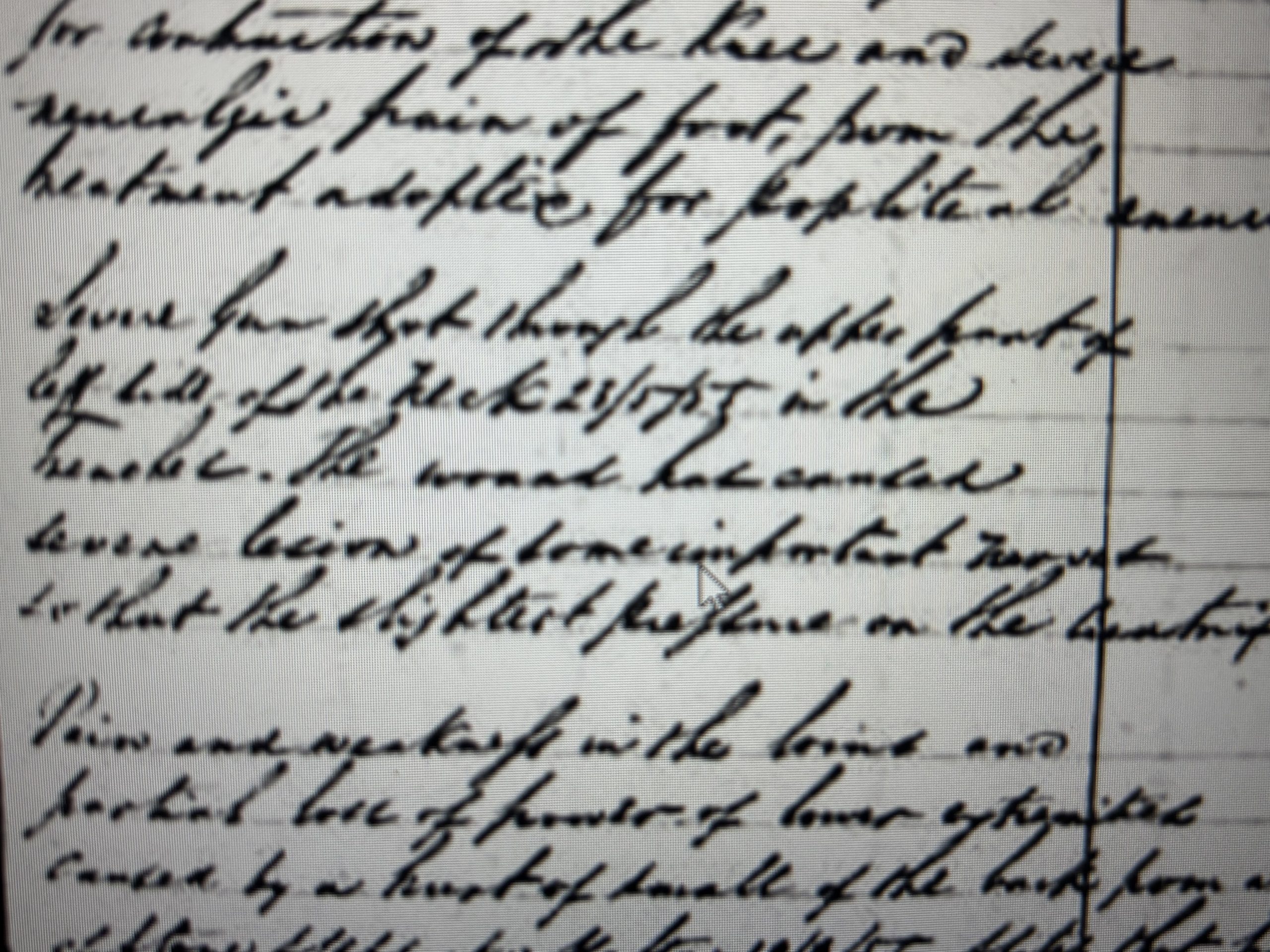 It is noted that he received a severe gunshot to the upper left of his neck which was to cause severe nerve damage leading to spasmodic convulsions.