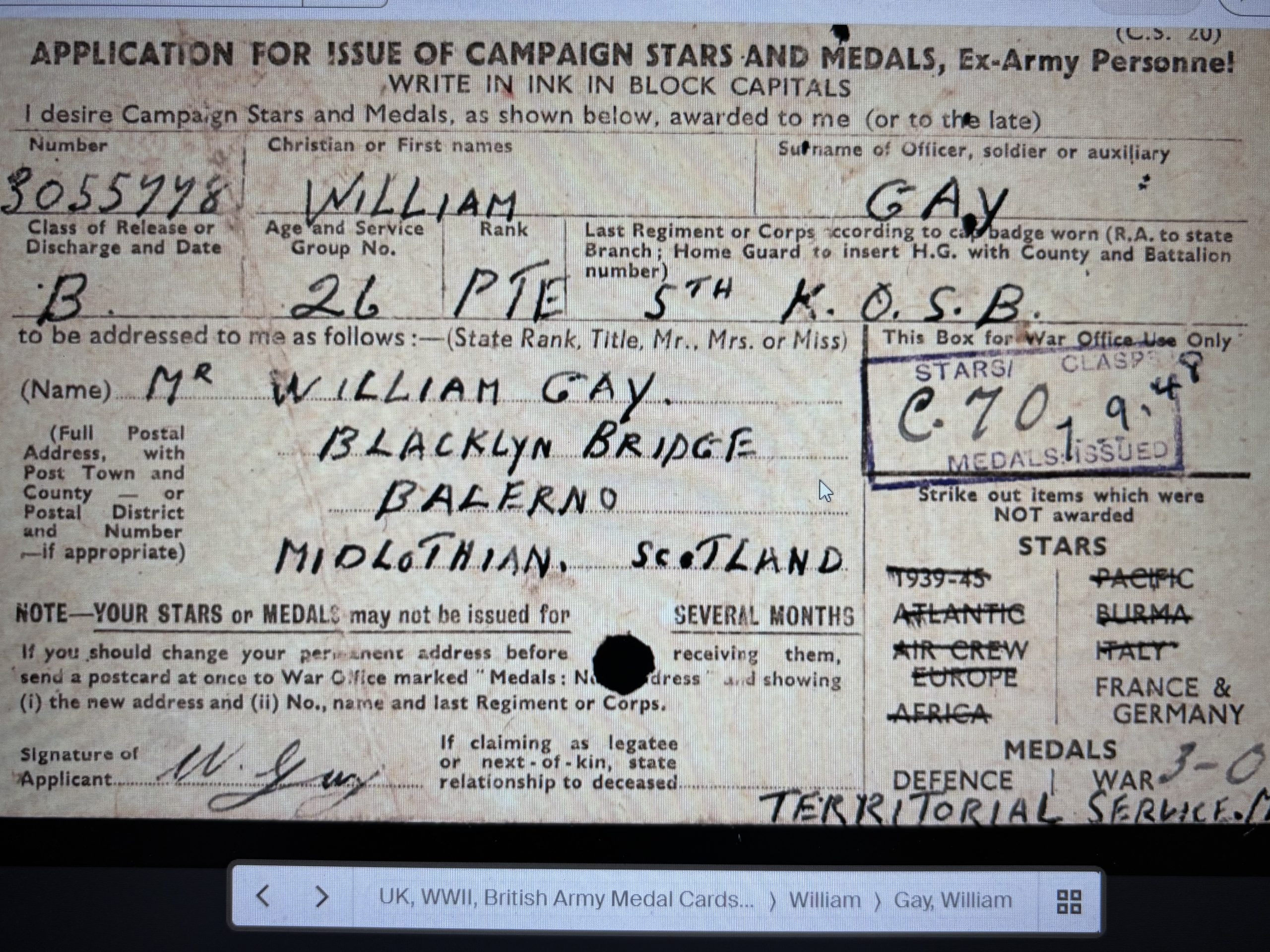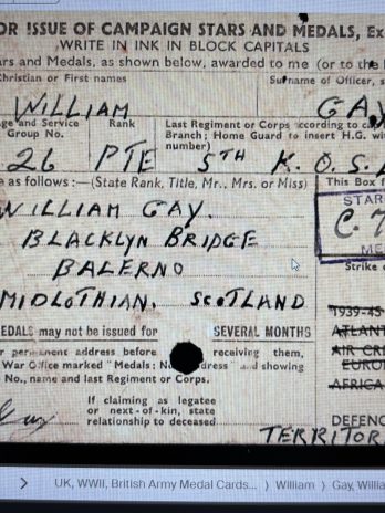 William Gay was born in June 1919 and first enlisted for service with the 5th Royal Scots but was immediately transferred into the 4/5thBn Kings own Scottish Borderers.