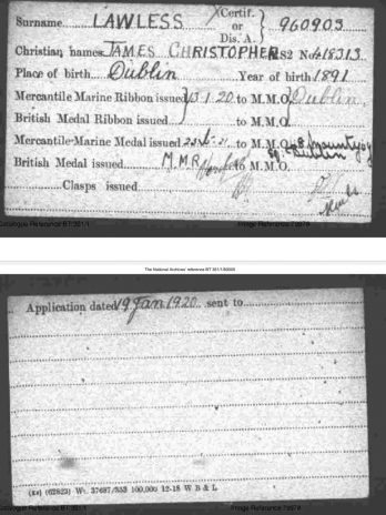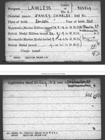 James Charles lawless born 1860 at Marylebone, a bandsman rms arlanza 19th November 1914 to 10th January 1915 ( an armed Merchant Cruiser).Ss Avon again bandsman 19th January 1915 to 21st March 1915 , 1921 85 Cheriton Road, Walthamstow Essex, and engineer labouer .
