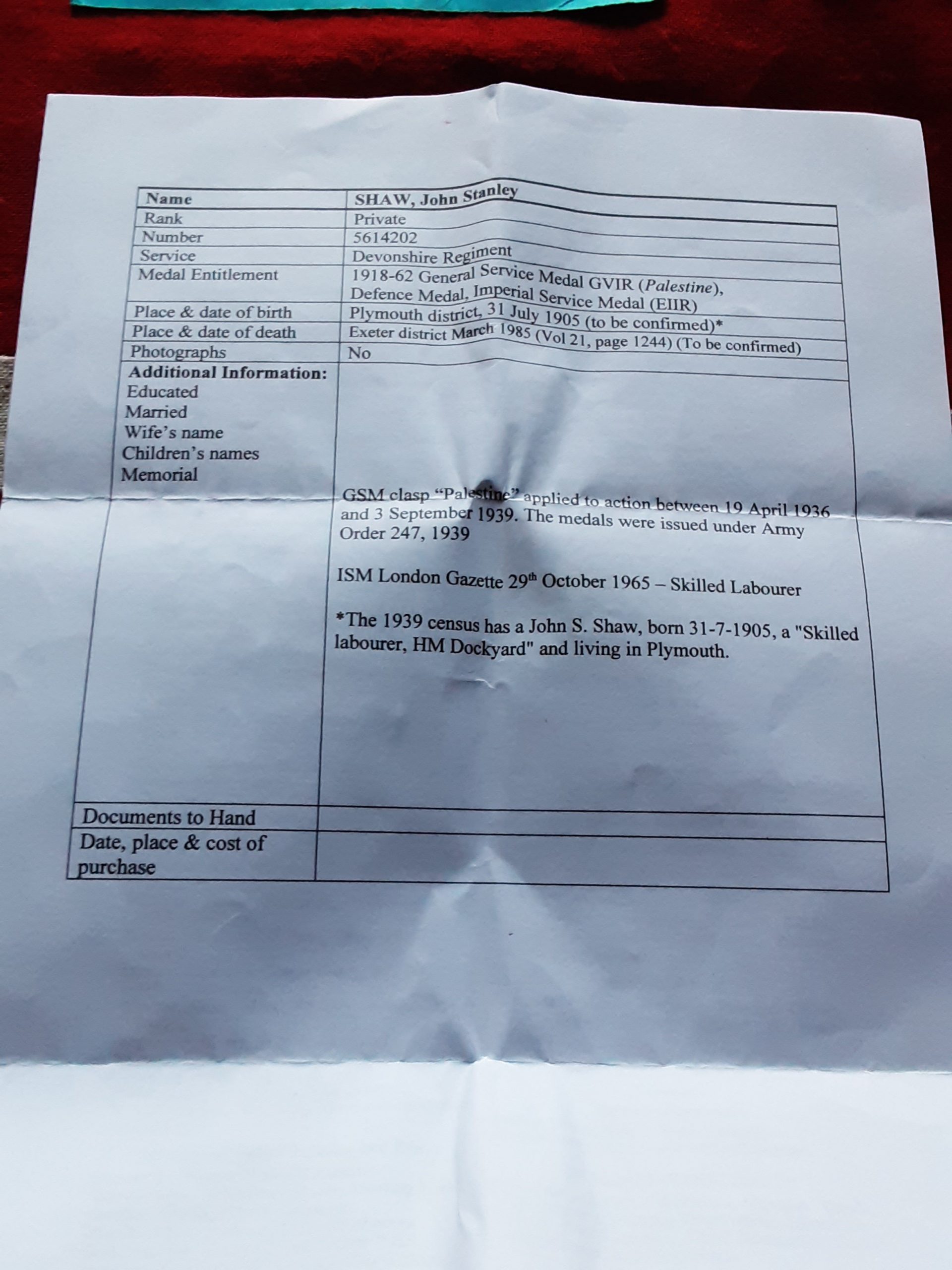 Palestine clasp General Service Medal named 5614202 pte j s Shaw Devon r duplicate ( THIS IS AN OFFICIAL REPLACMENT FOR A LOST MEDAL ) .