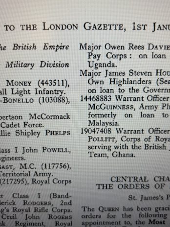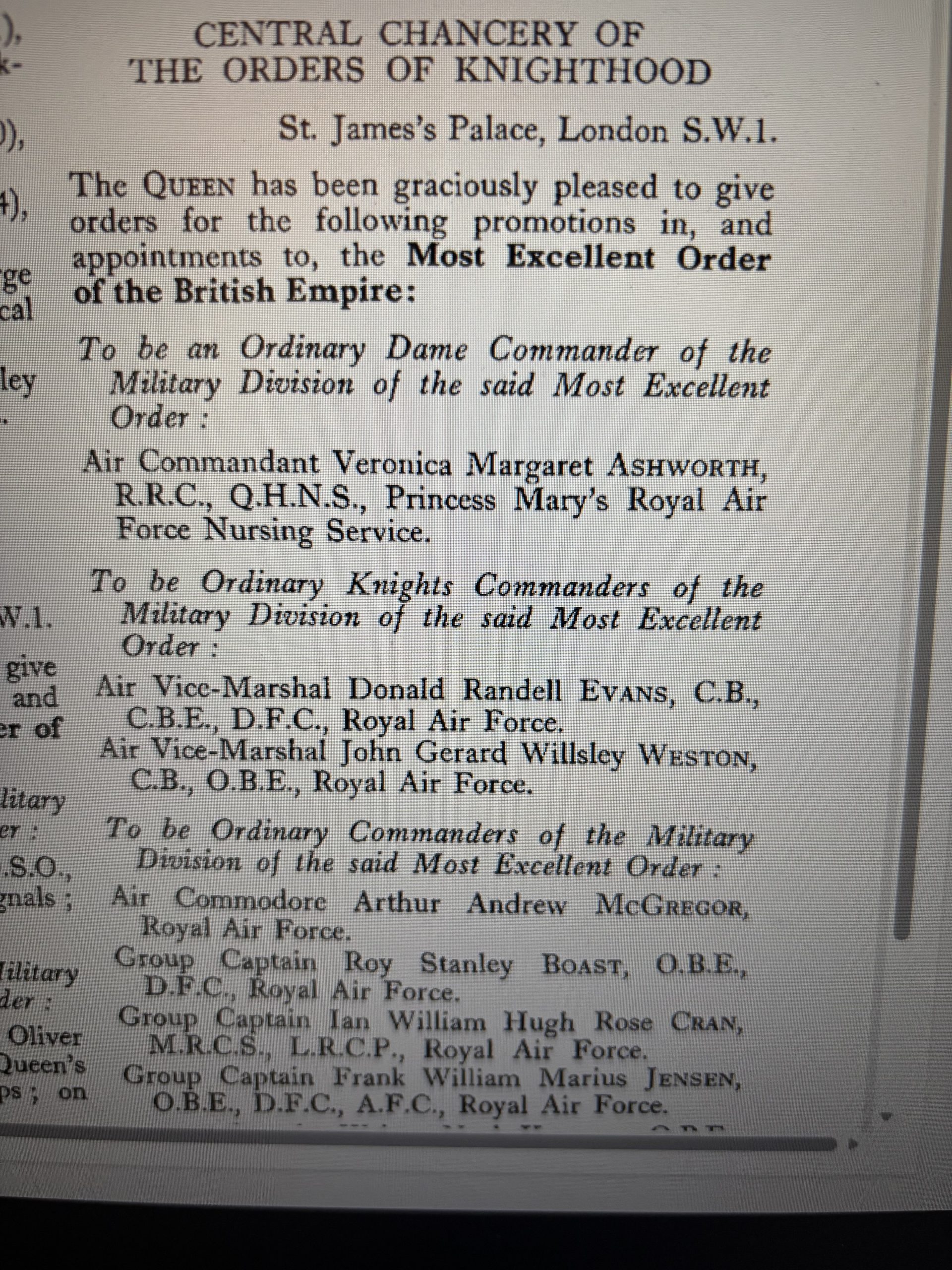 He was awarded his CBE in 1964 as Air Commodore, LG 1/1/1964. Command Education Training Officer, Technical Training Command, Forfar.