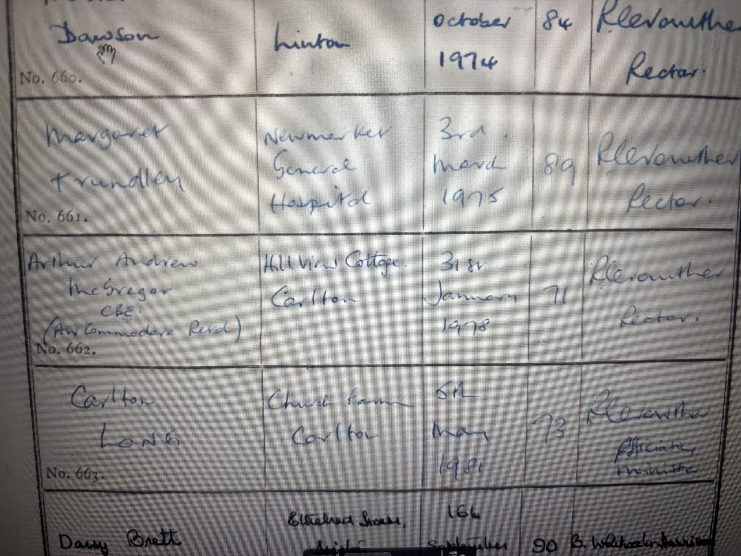 He died in 1972 and is buried in Carlton Cum Willingham, Cambridge. His address is noted as Hill View Cottage, Carlton.
