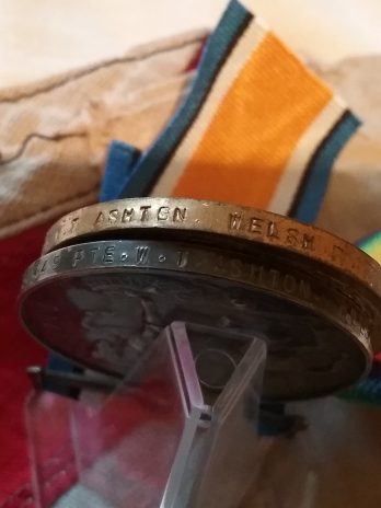 WW1 pair on replacement ribbon named to 56449 Pte WT Ashton Welsh R