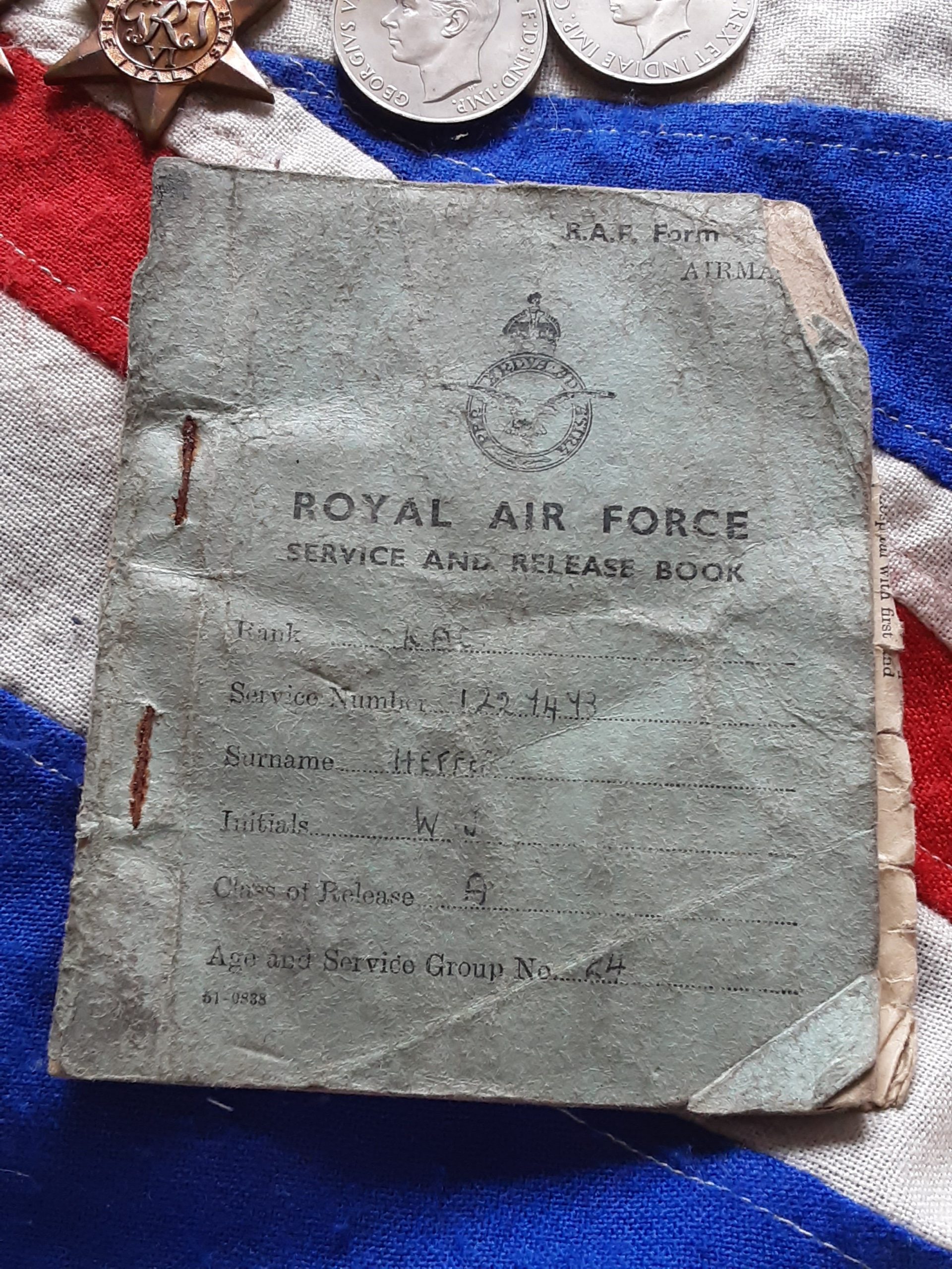 Tatty raf service book confirming his service as leading aircraftman.