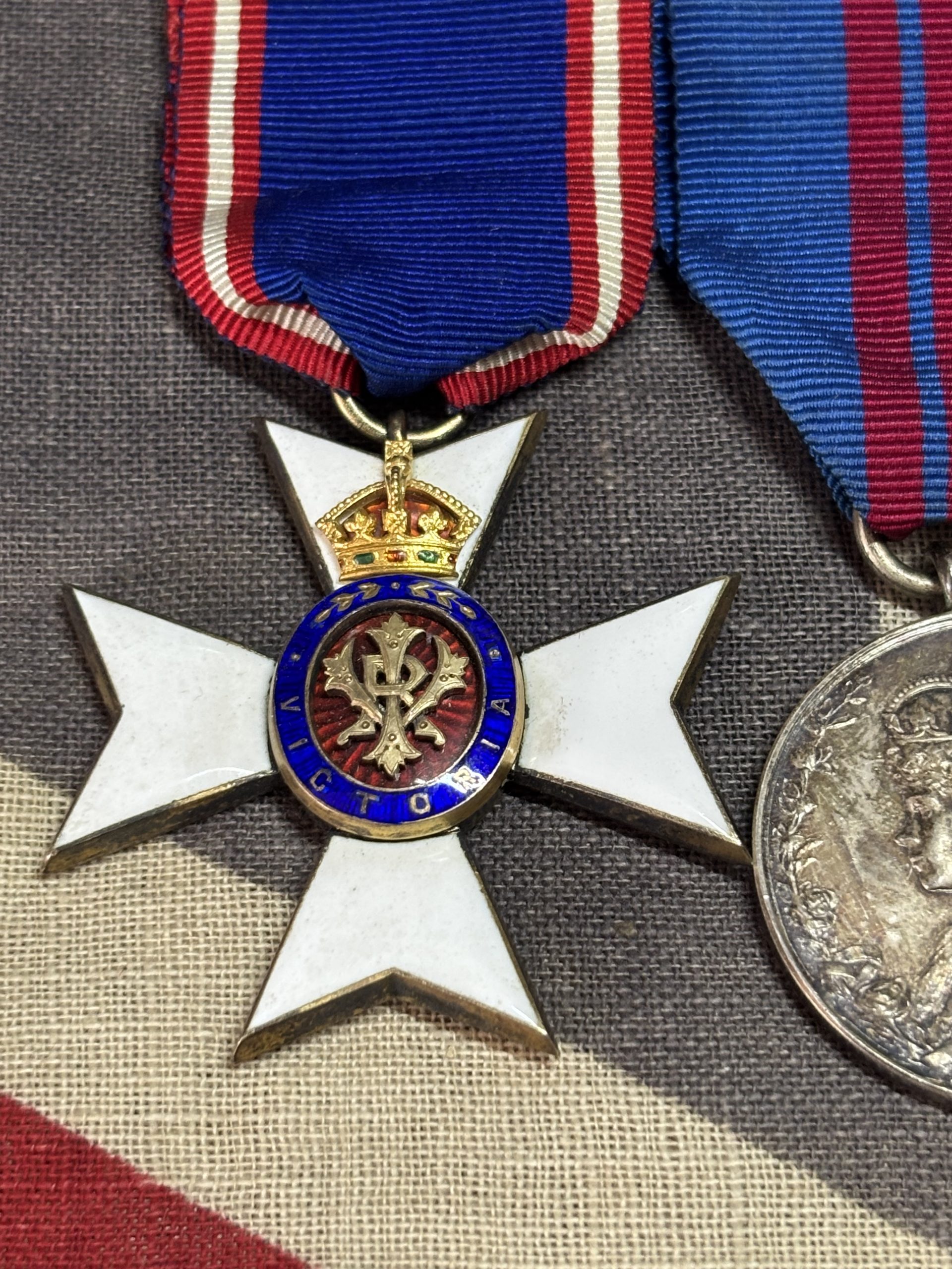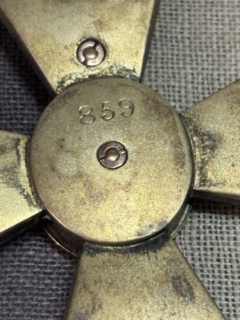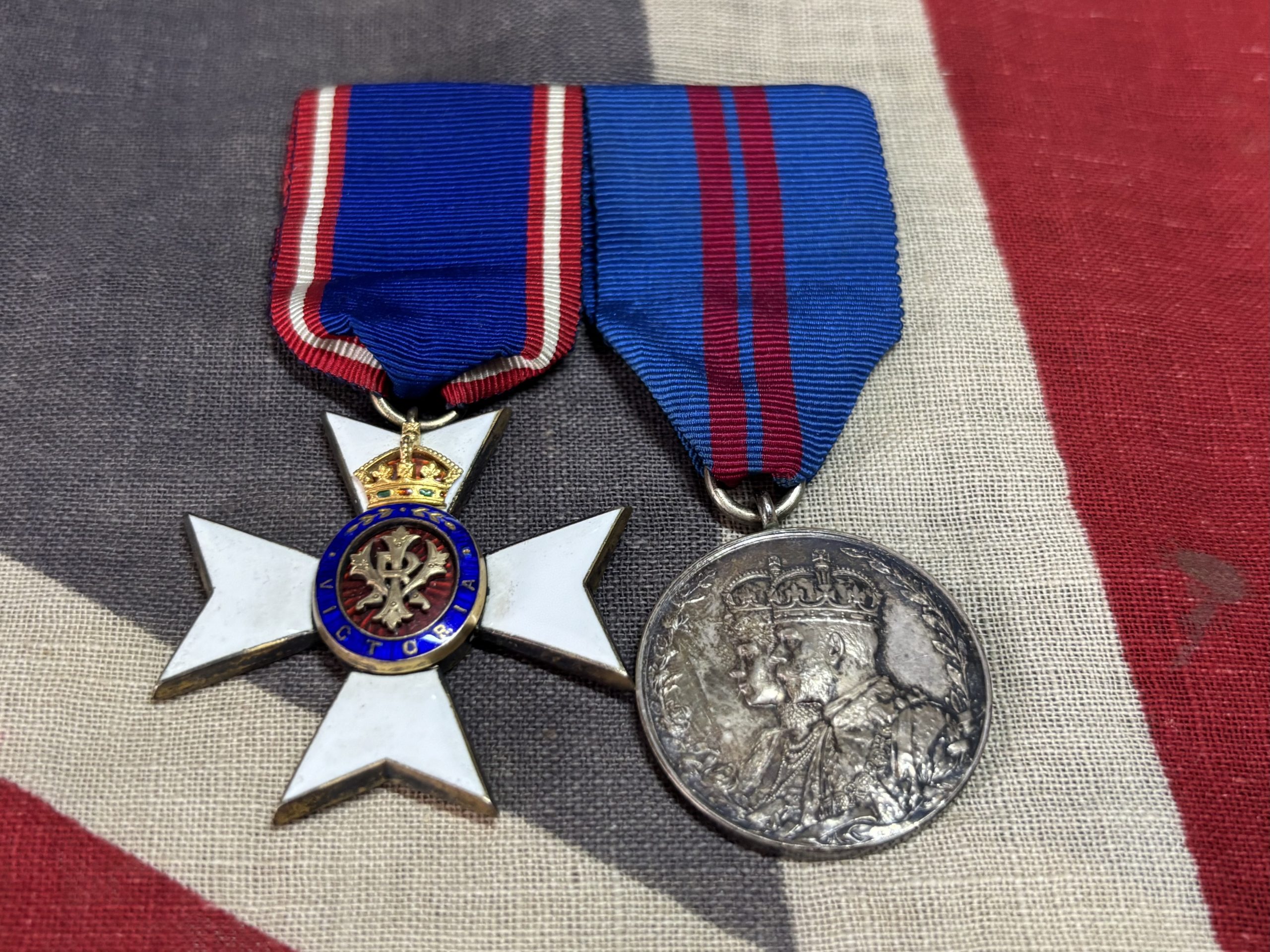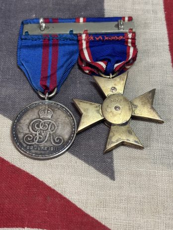 Lovely swing mounted pair on original ribbons. Note the pin of the clasp is missing.