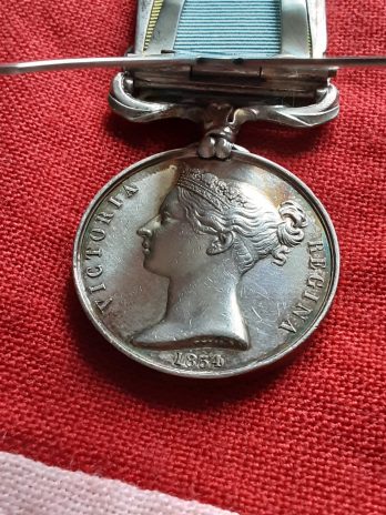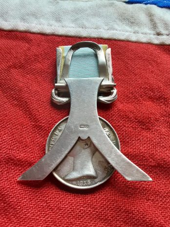 British crimean war medal unnamed as issued incorporated into the menu holder made by horton & allday .