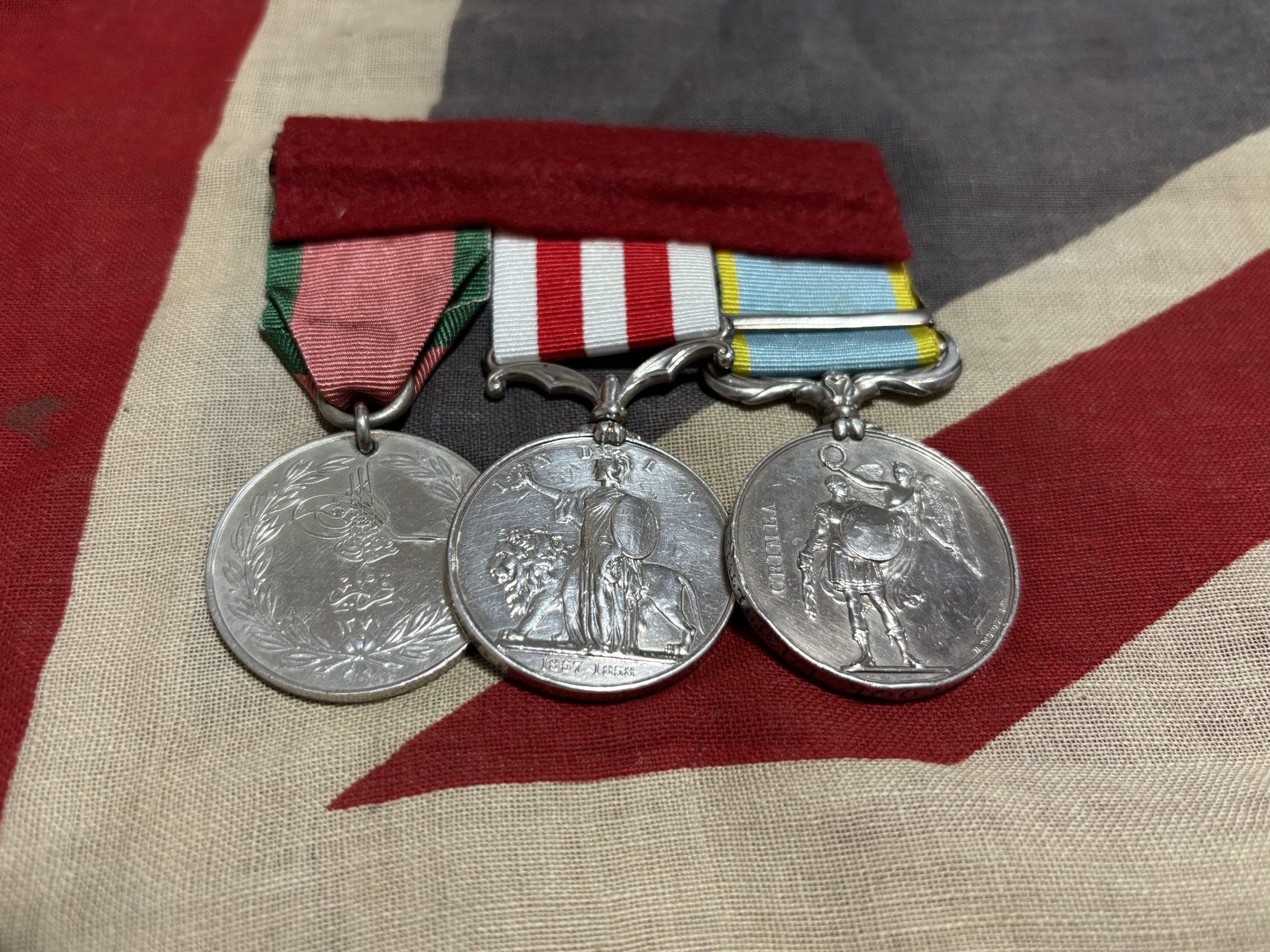 Medal group consisting of Crimea Medal with Sebastopol clasp, no clasp India Mutiny Medal and Turkish Crimea, Sardinian issue.