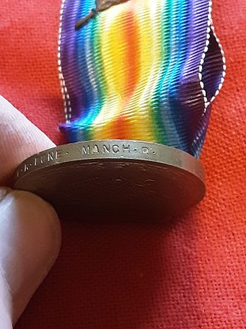 Ww1 Victory Medal on long original ribbon with sewn on mentioned in despatches oakleaf .