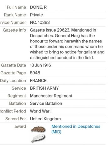 Mentioned in general Haigs dispatches 13th June 1916 for gallant and distinguished Conduct in the field .