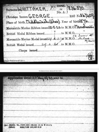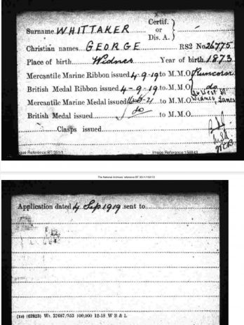 There are two George whittaker listed see the pictures for digital only images of the Medal award cards from Mercantile Marine.