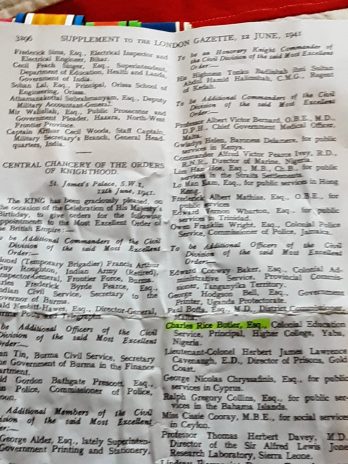 Civil mbe in London gazette 12th June 1941 whist serving with colonial education service , as principal, higher college, yaba , Nigeria.