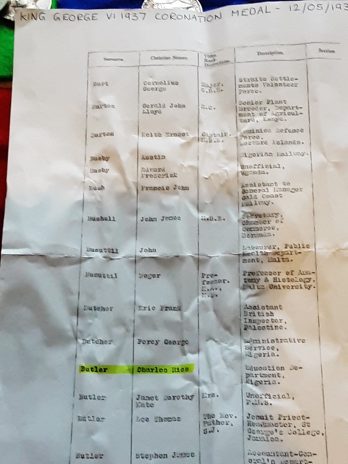 On the 1937 coronation medal roll as with the education department, Nigeria.