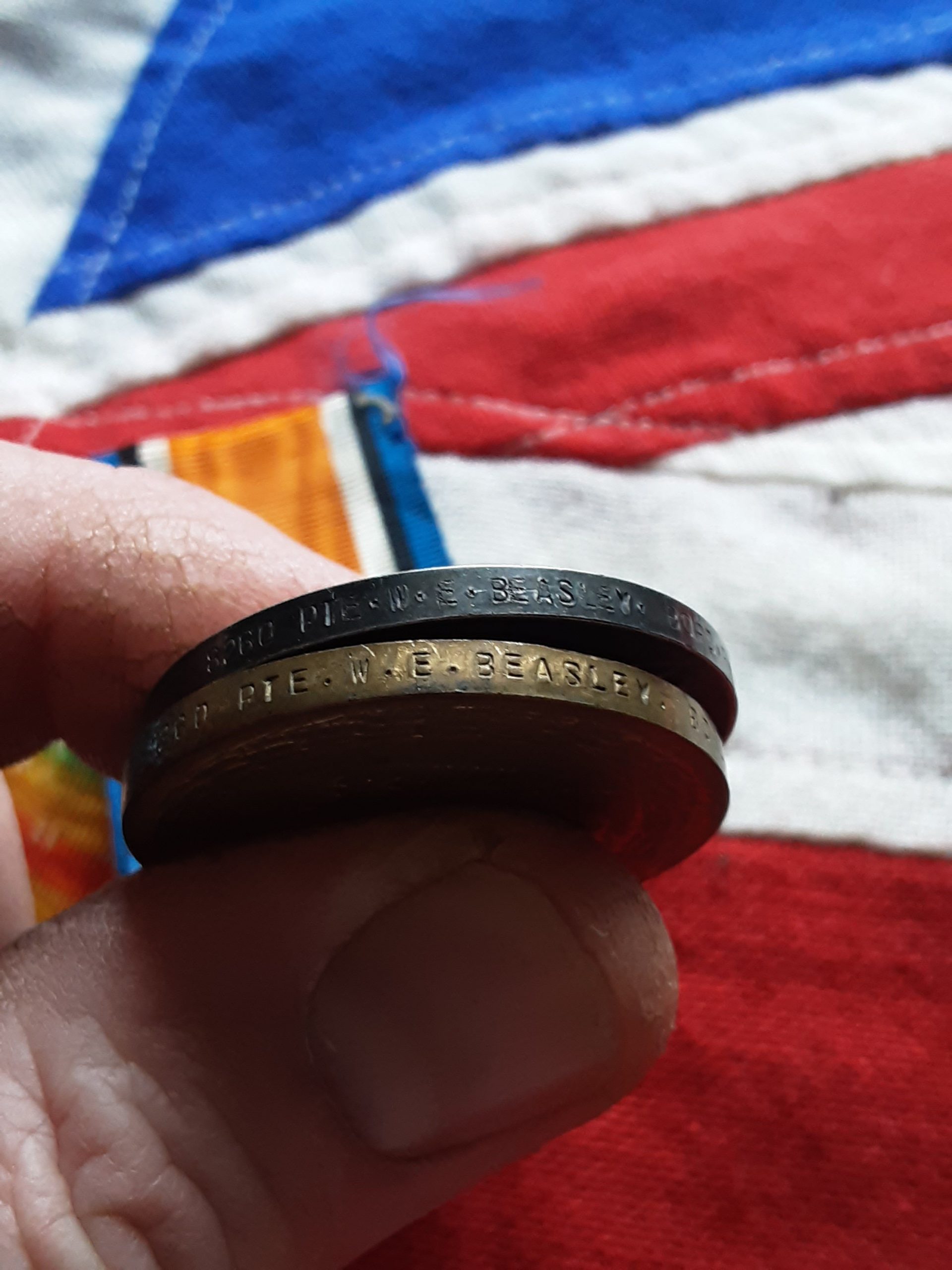 Ww1 pair on short tatty original ribbons named to 8260 pte w e beasley bord r .