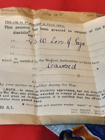 A pair with long original ribbons , ribbon bar and original pension slip for Feb 1920 to Feb 1921 confirming his pension and loss of eye due to gunshot .