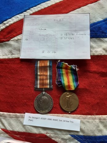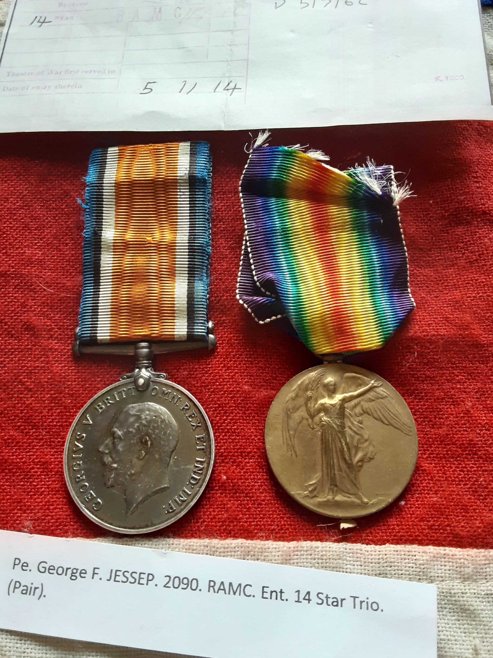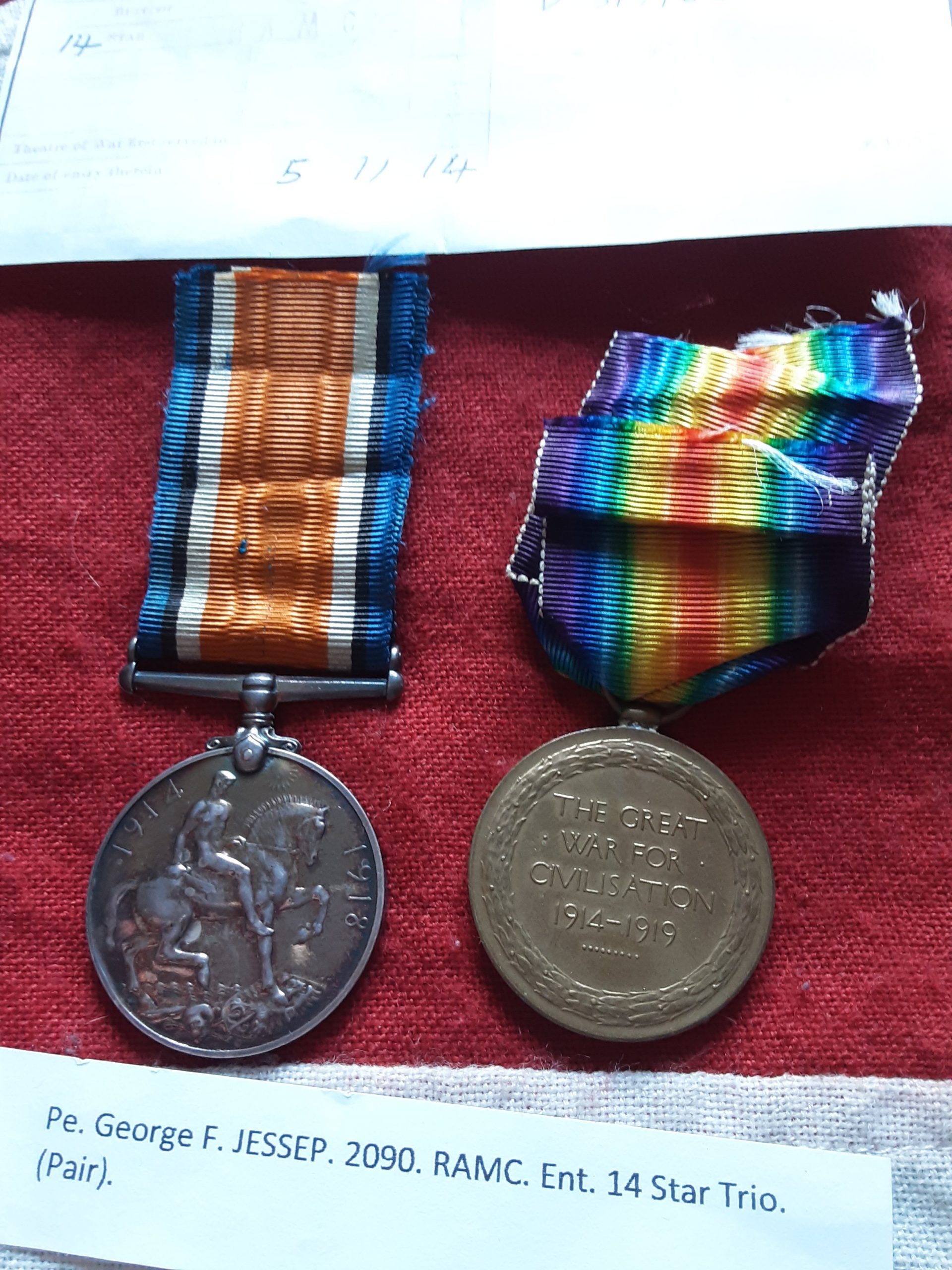 Ww1 pair on short original ribbons named to 2090 pte g f jessep ramc .