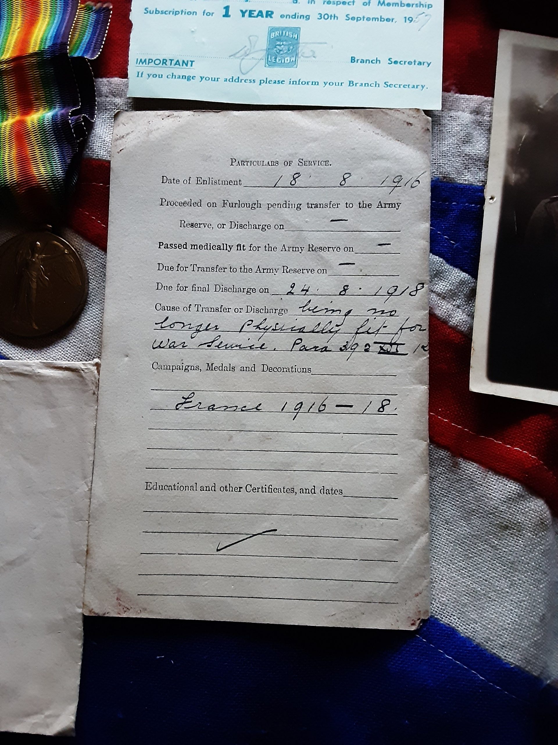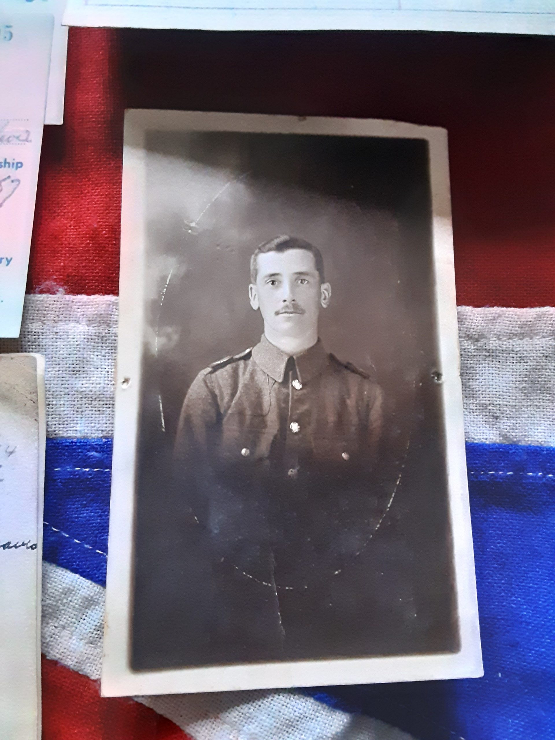 He served 18th August 1916 to 24th August 1918 being wounded gsw forearm 19th July 1918 and discharged 60 % disablement due to wounds.