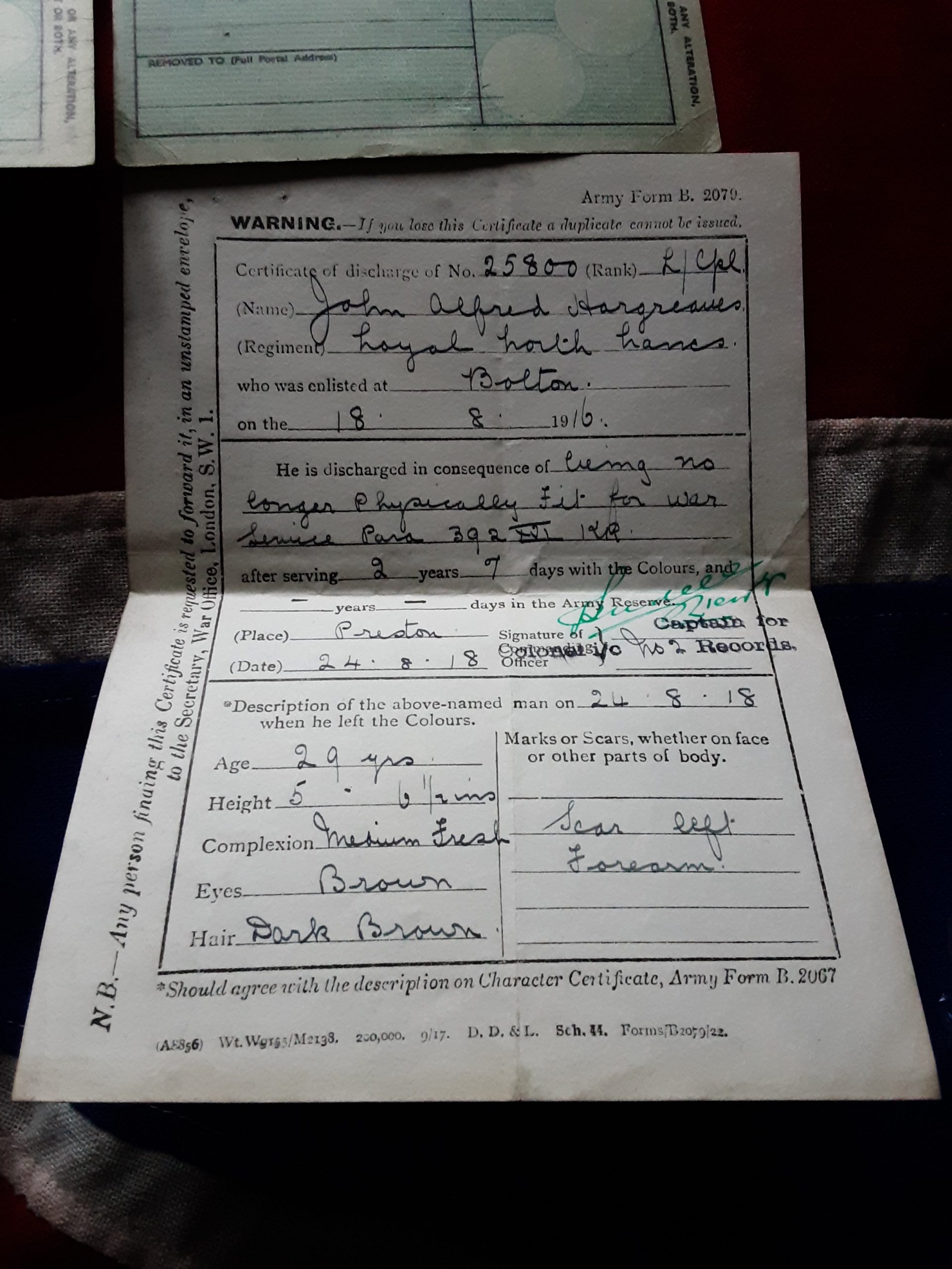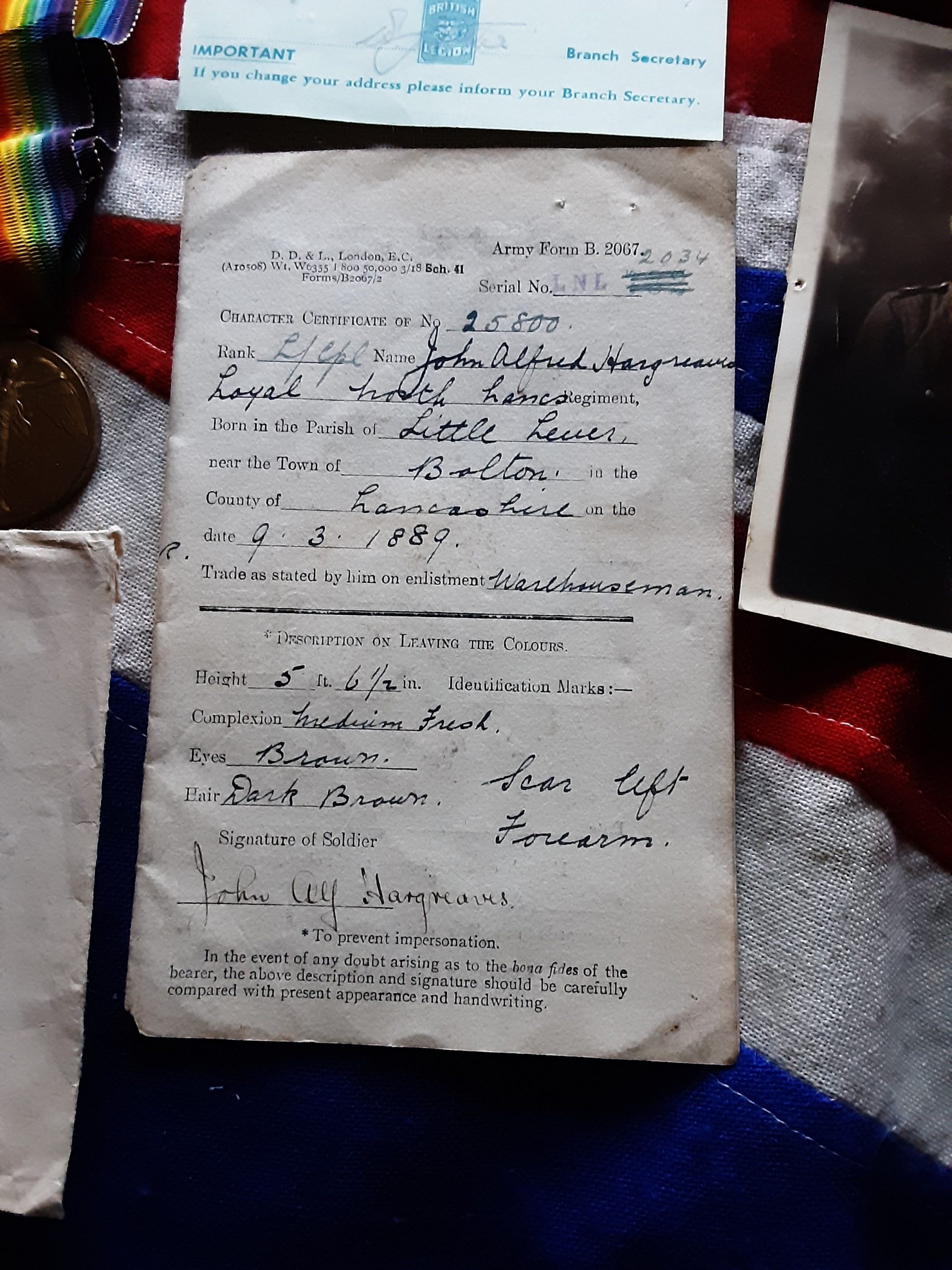 His original army form b stating John Alfred Hargreaves was born at Little lever ,Bolton, Lancashire 9th March 1889 .a warehouseman by occupation.
