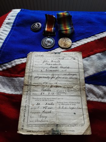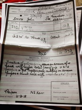 Enlisted 4th December 1915 and discharged with 40% disablement due to gunshot shot wound right hand 27th match 1918 .