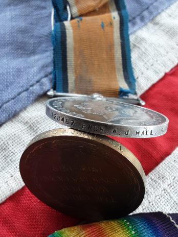 WW1 Pair on original ribbons named to 128487 Bmbr WJ Hall RA