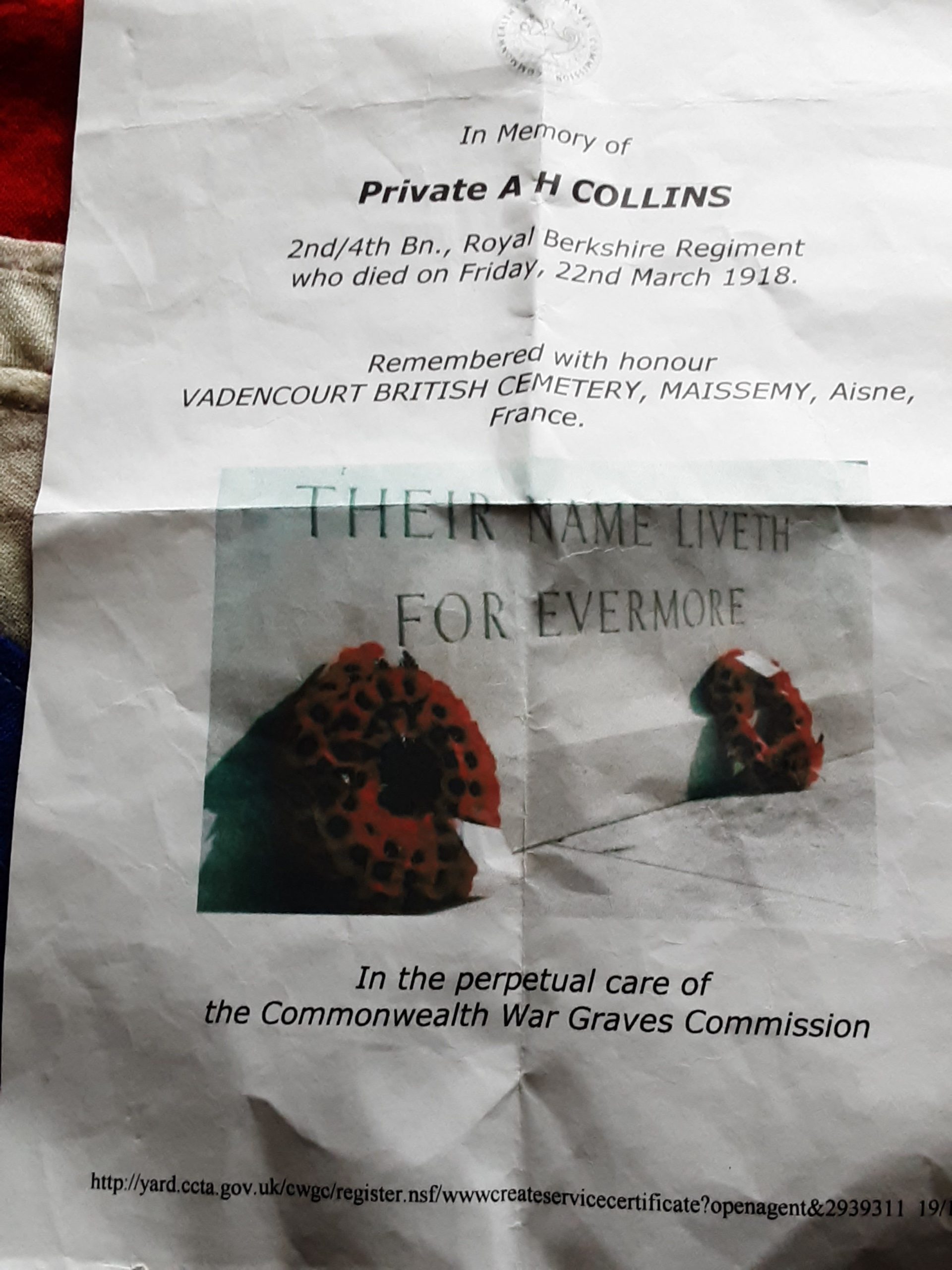 Arthur Henry Collins was noted as missing 21st March 1918 the 1st day of spring offensive then later noted as killed in action 22nd March 1918 in reality he was killed in 1st day or two of the German spring offensive during which time his unit the 2nd / 4th Battalion royal Berkshire Regiment was involved in heavy fighting during the battle of St quentin.