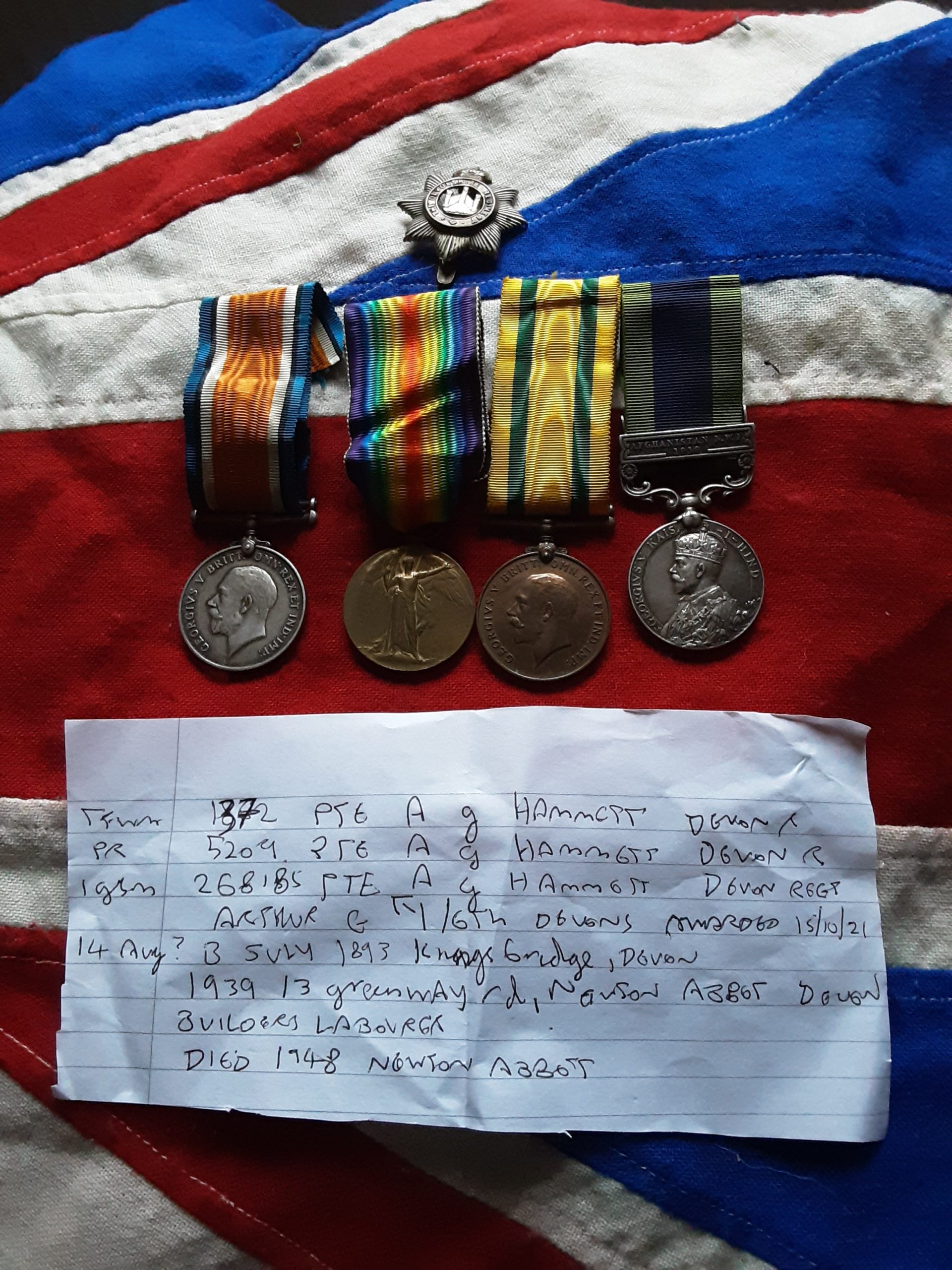 India general service medal with Afghanistan nwf 1919 clasp 268185 pte a g hammett Devon regt .