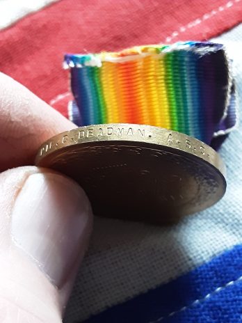 A ww1 victory on short original ribbon named to m2 175347 pte c deadman asc.