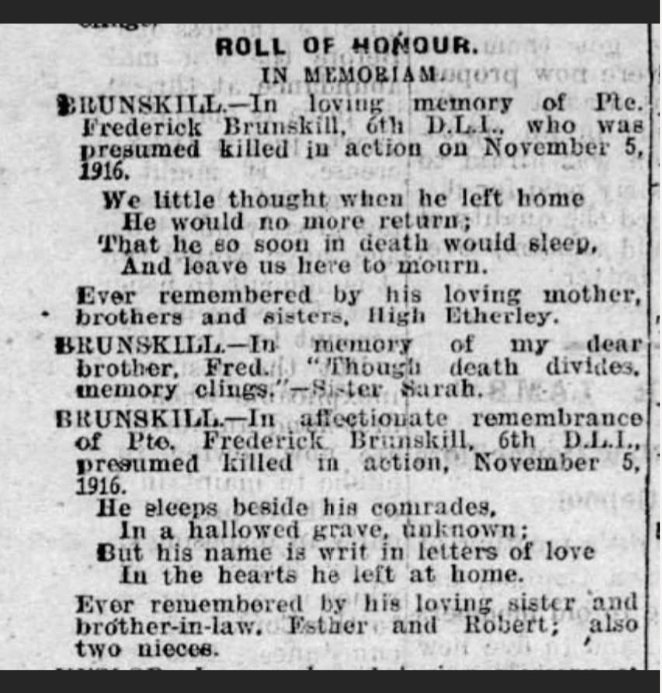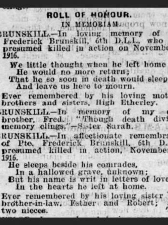 Fred brunskill was born c1897 at Etherley, bishops Auckland, Co Durham.