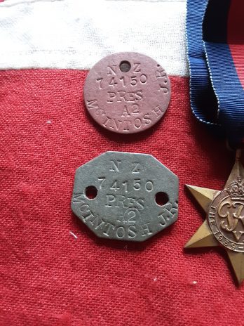2 x I’d tags nz 74150 pres a2 mcintosh j r , new Zealand shoulder title and capbadge .