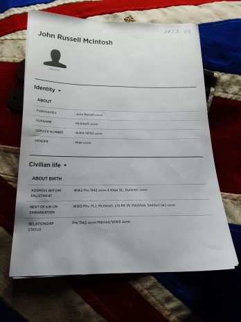 John Russell mcintosh enlisted in 1942 at dunedin ,otago.seeved with 3rd nz divisional postal unit & nz engineers with 2nd new Zealand expeditionary force.
