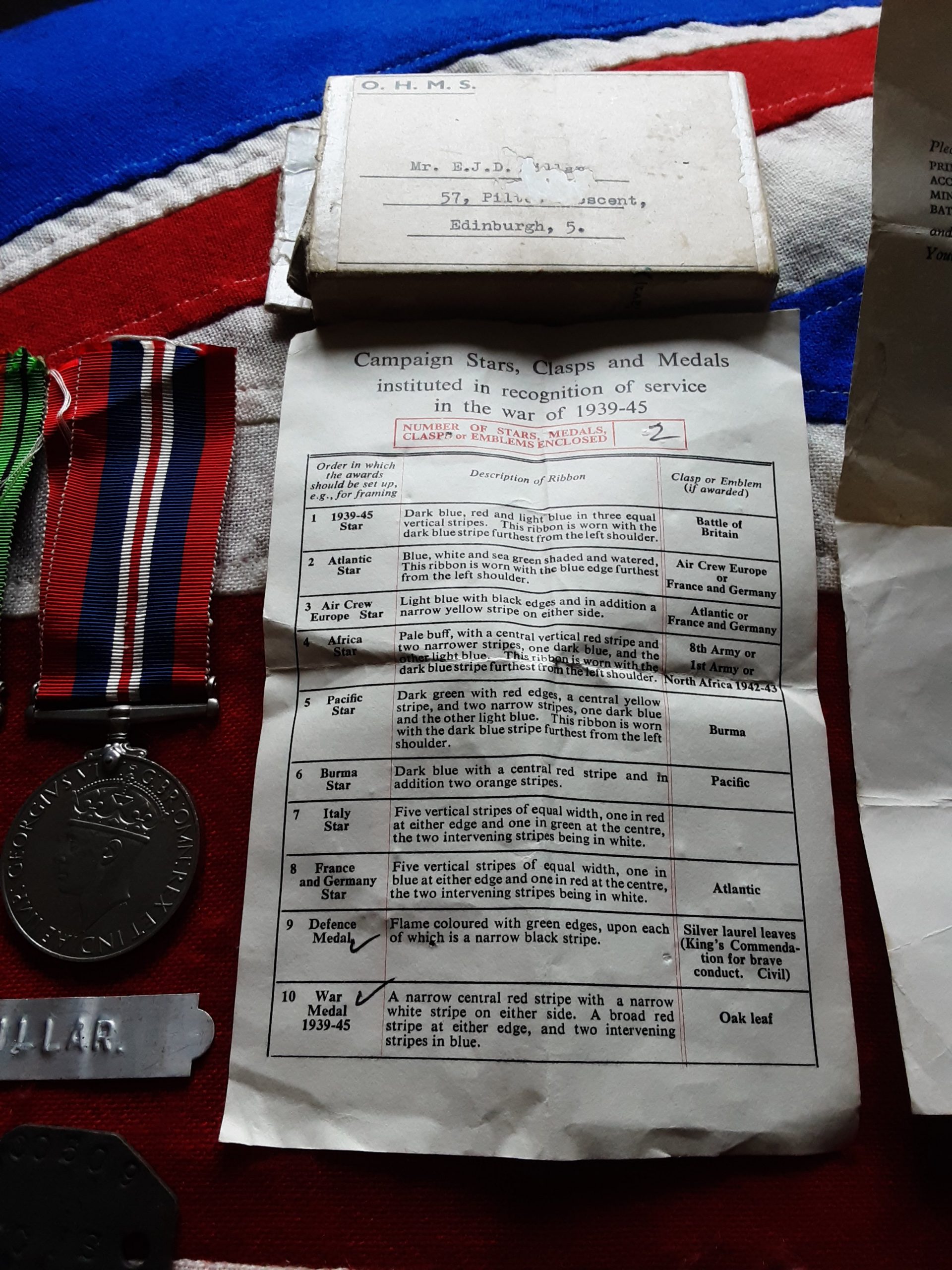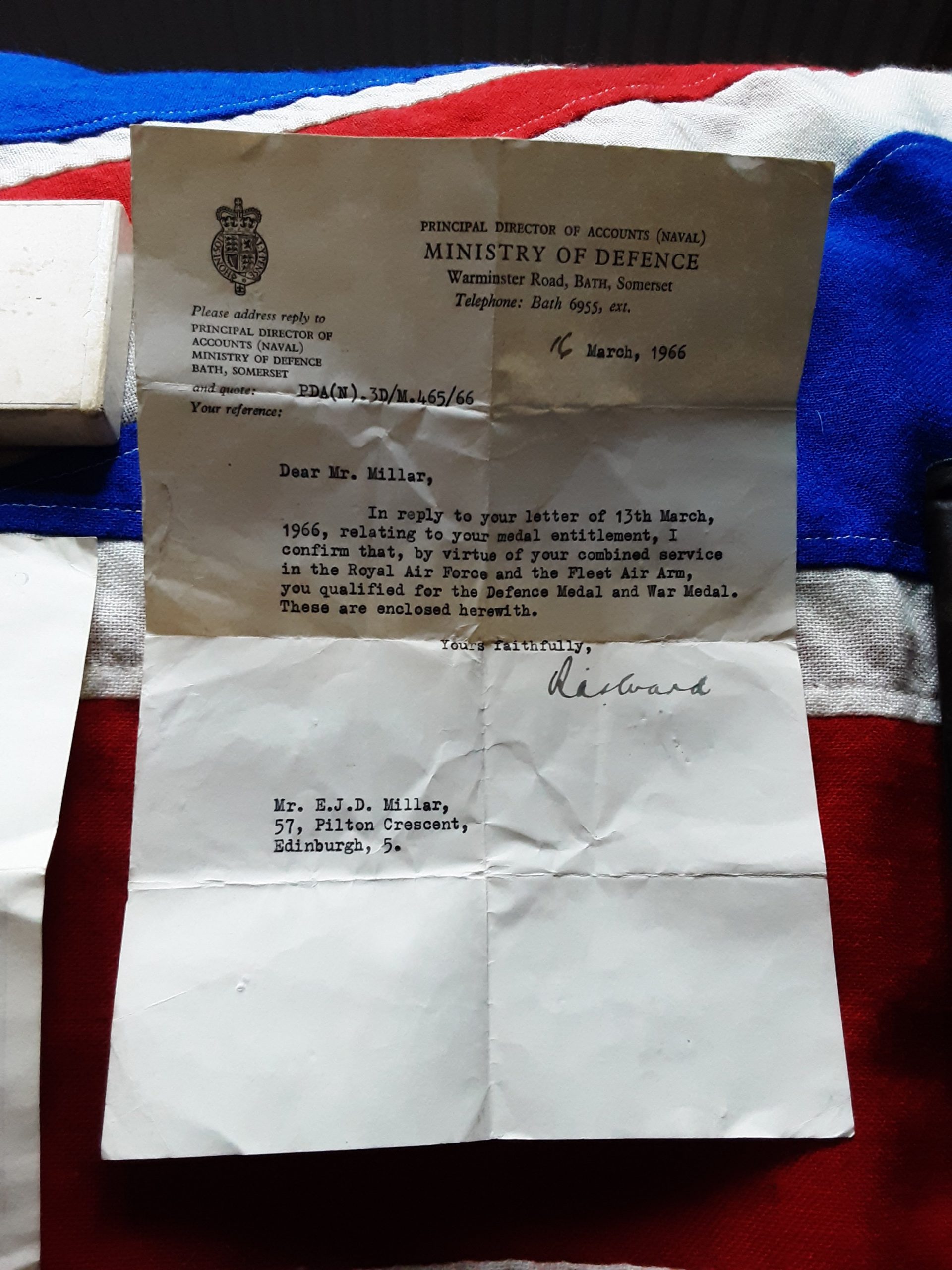 Mod letter dated March 1966 stating his entitlement for service in Royal Air force & fleet Air arm addressed to Mr e j d millar ,57 ,Pilton crescent, Edinburgh, 5.