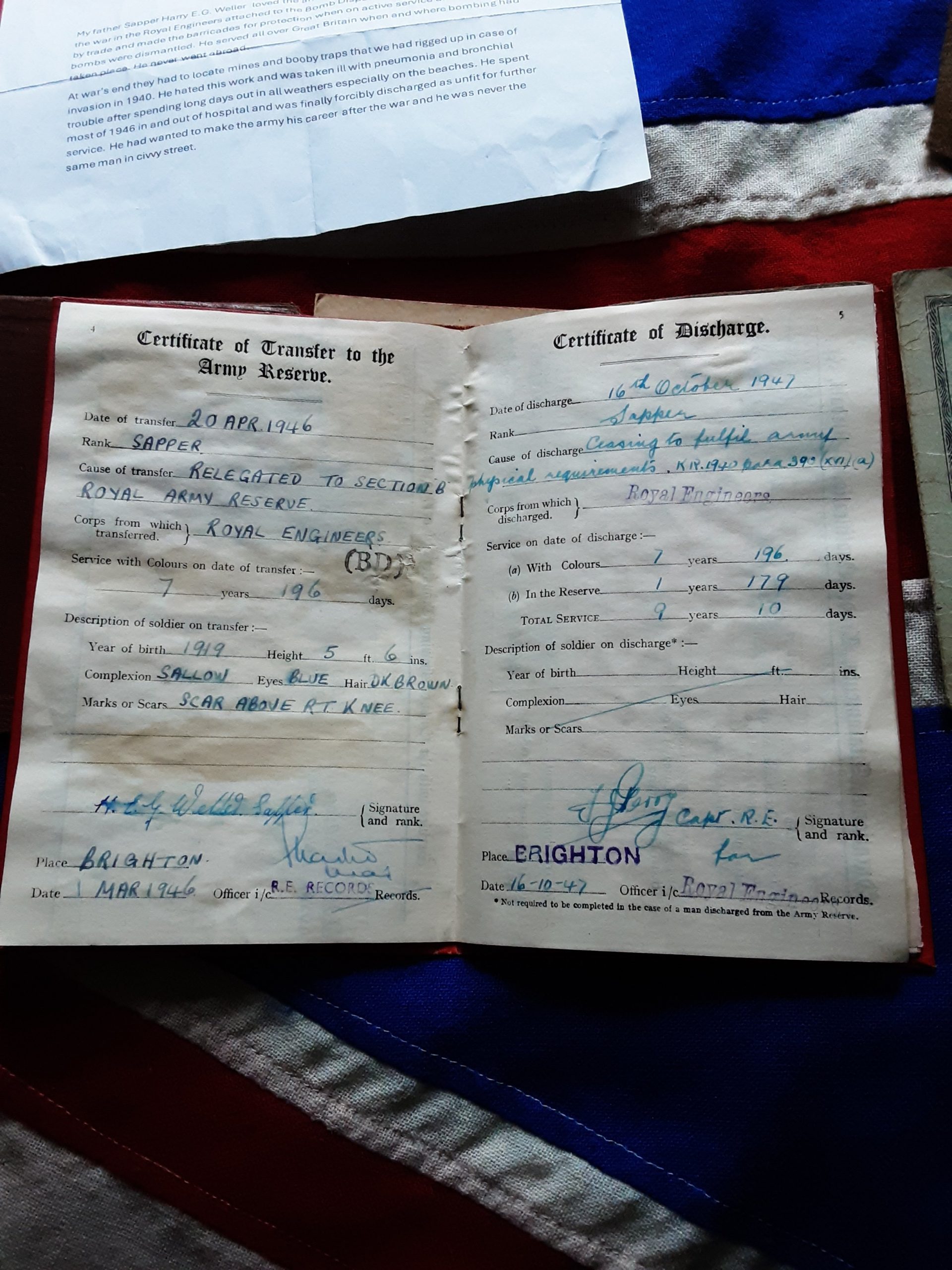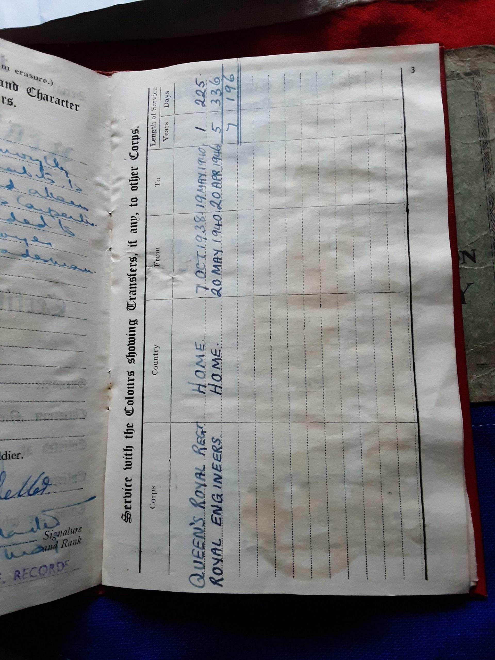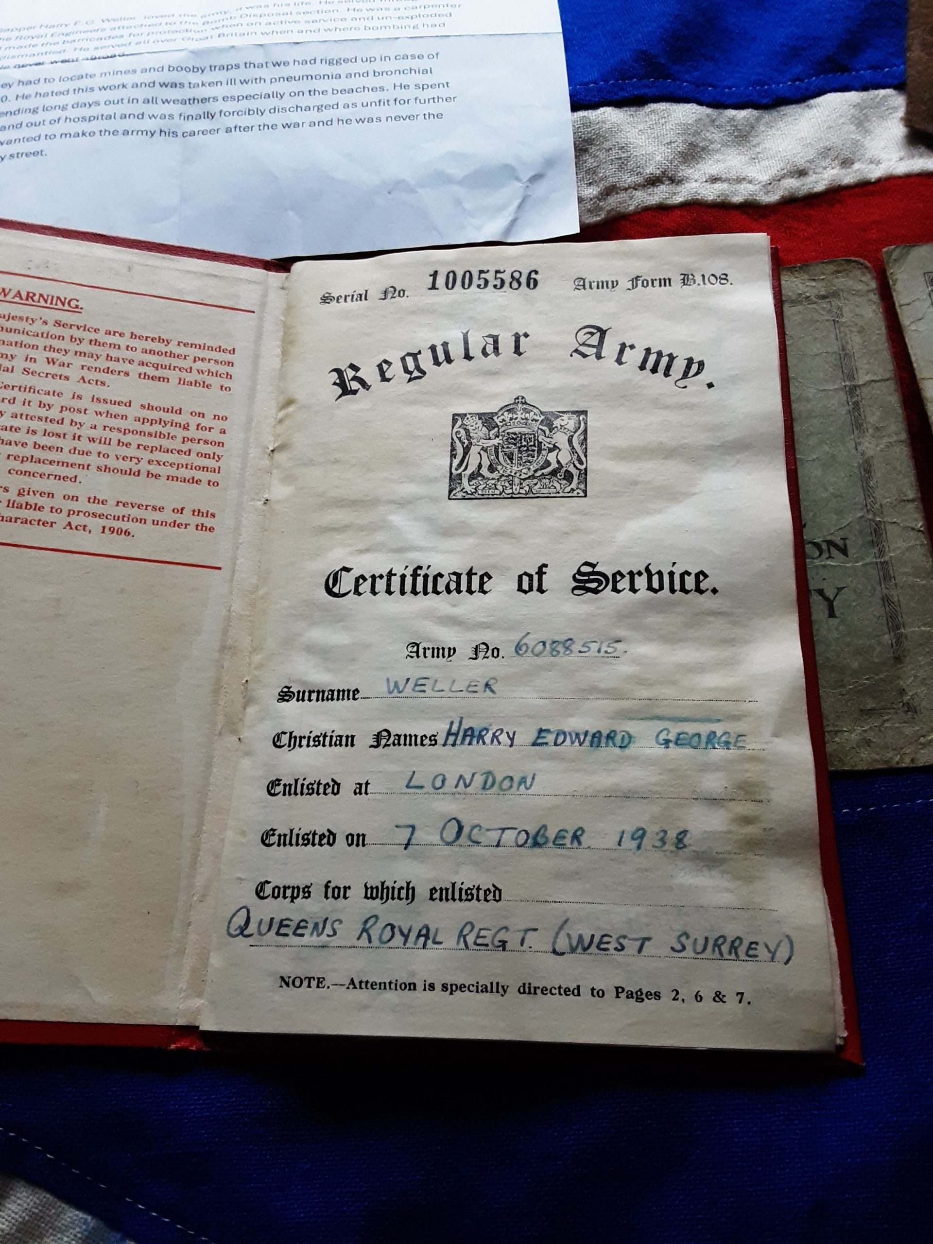 Red regular army certificate of service confirming 6088515 Harry Edward George weller enlisted into the Queens Royal West Surrey Reg 7th October 1938 ,he transferred into Royal engineers May 1940 stamped bd for bomb disposal . ( book has been slightly damp in past )