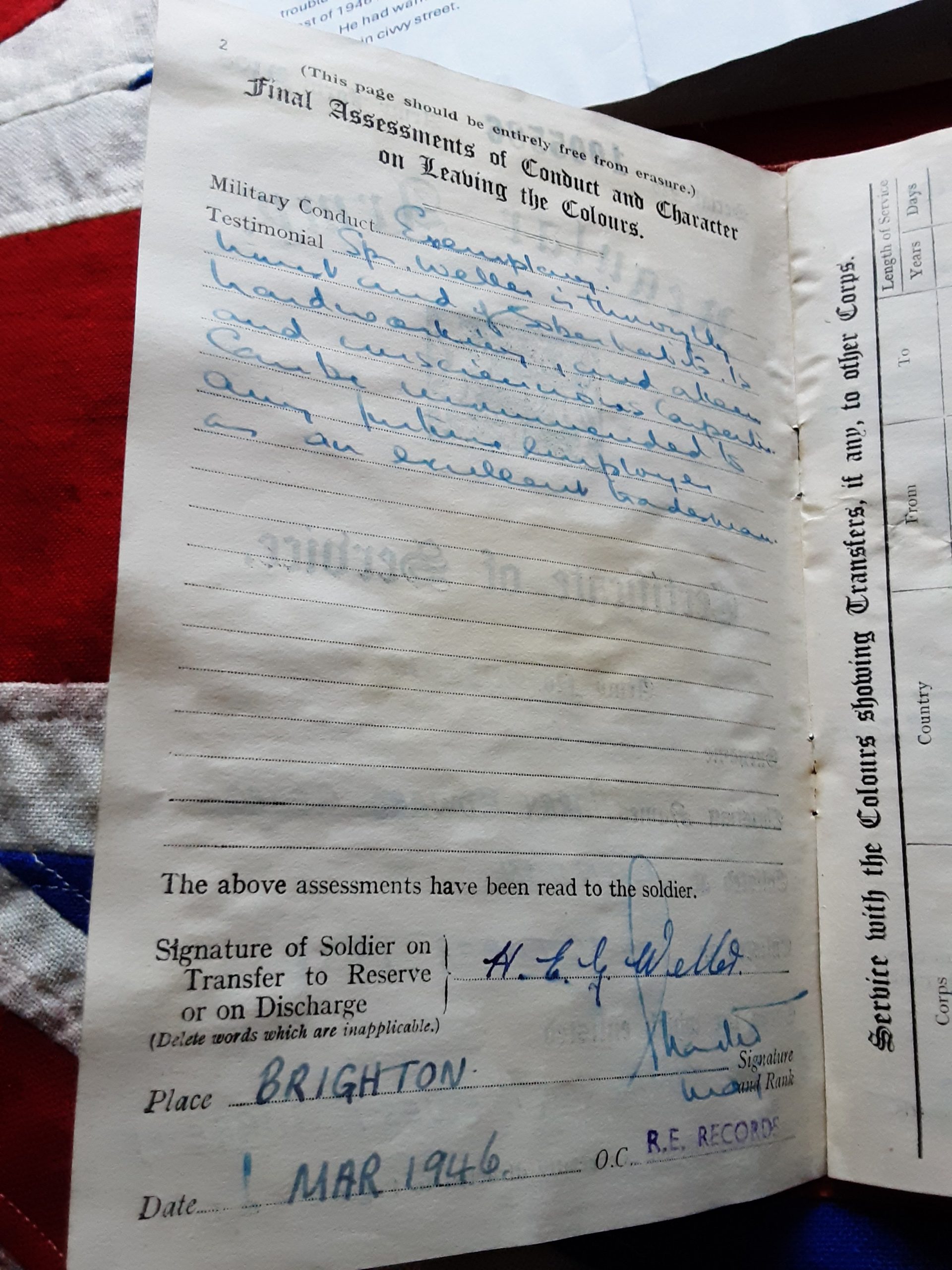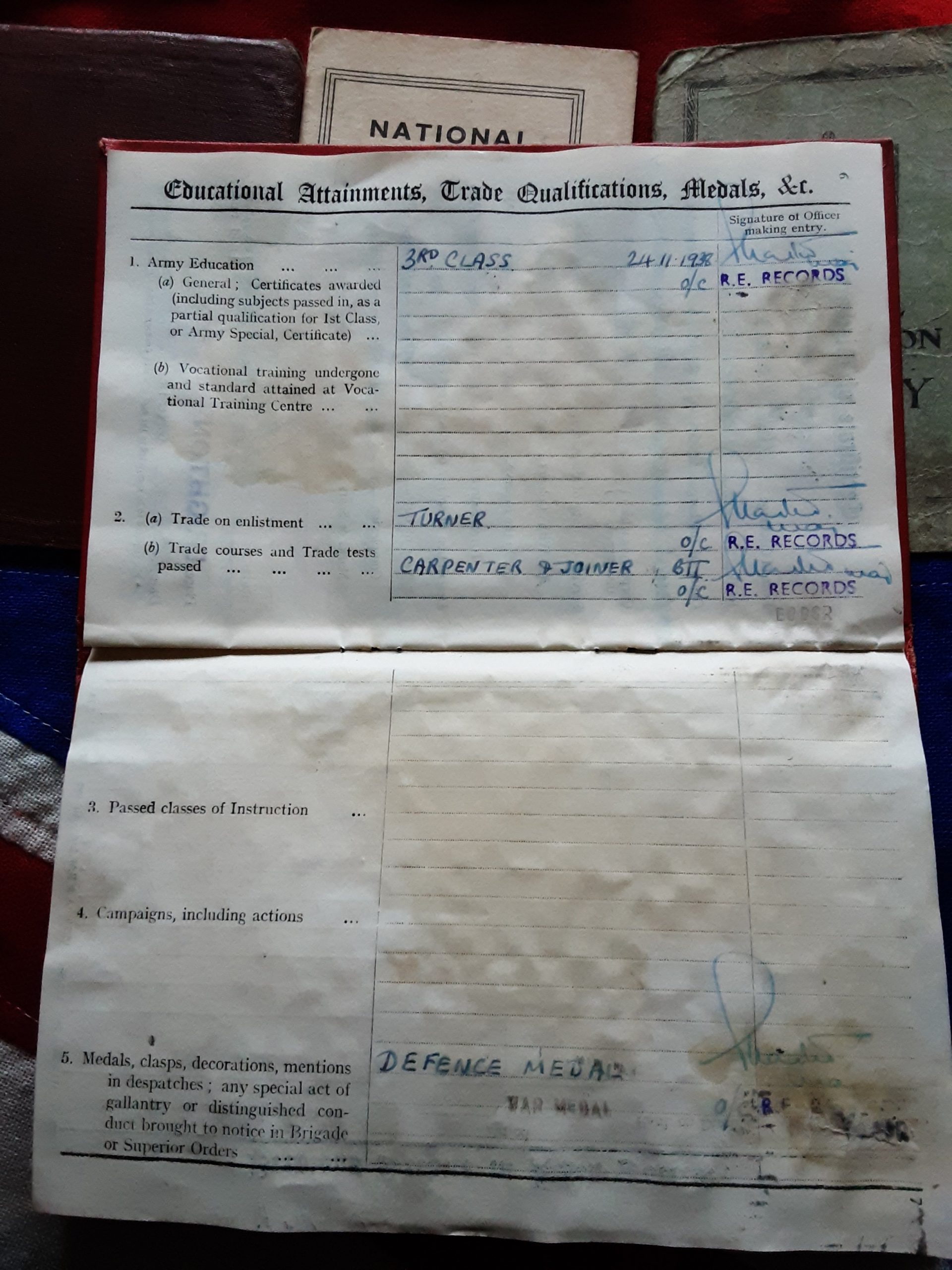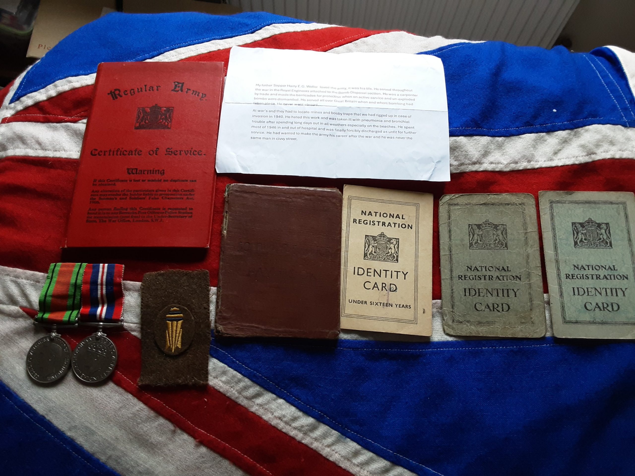 Red regular army certificate of service confirming 6088515 Harry Edward George weller enlisted into the Queens Royal West Surrey Reg 7th October 1938 ,he transferred into Royal engineers May 1940 stamped bd for bomb disposal . ( book has been slightly damp in past )