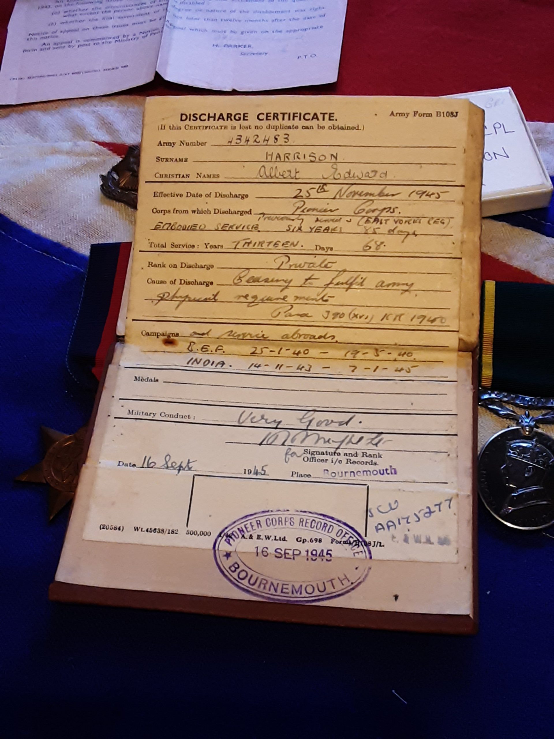 Soldiers Service and pay book albert edward Harrison served bef Jan to May 1940 later served India 1943 to 45 with pioneer Corps.