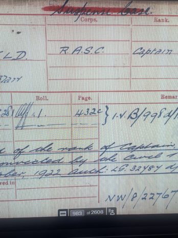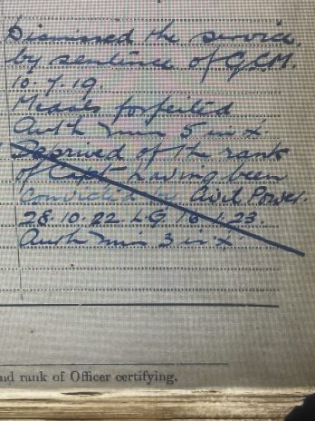 His medal index card and rolls both indicate that he was stripped of the rank of Captain due to being convicted by a Civil Power.