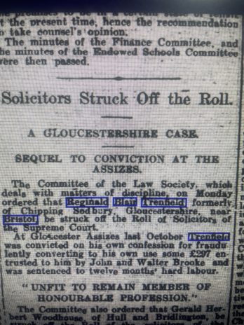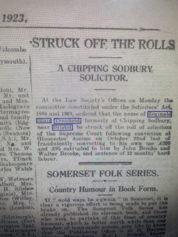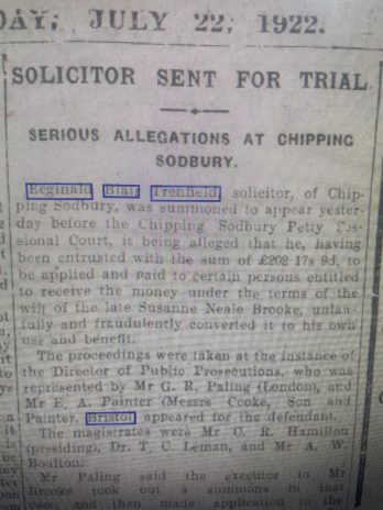 ​In 1922 there was a theft by a solicitor acting for the estate of my great grandmother. The family originally believed that it was committed by JW Trenfield but it turned out that the perpetrator was his son, Reginald Blair Trenfield, the son misappropriated £202.17s.9d (worth over £9,000 in today’s money) plus two cottages at Old Sodbury, which he then sold. The case was taken over by the Director of Public Prosecutions following an initial hearing. My grandfather John gave evidence citing his address as ​1 The Firs, Kingsdown, and the case was referred to the Court of Assize. Eventually John and his son Arthur were appointed new trustees of the estate and the sales repudiated. Reginald Trenfield was sentenced to a term of imprisonment with hard labour, although the Brooke family never recovered any of the money he had stolen from them.